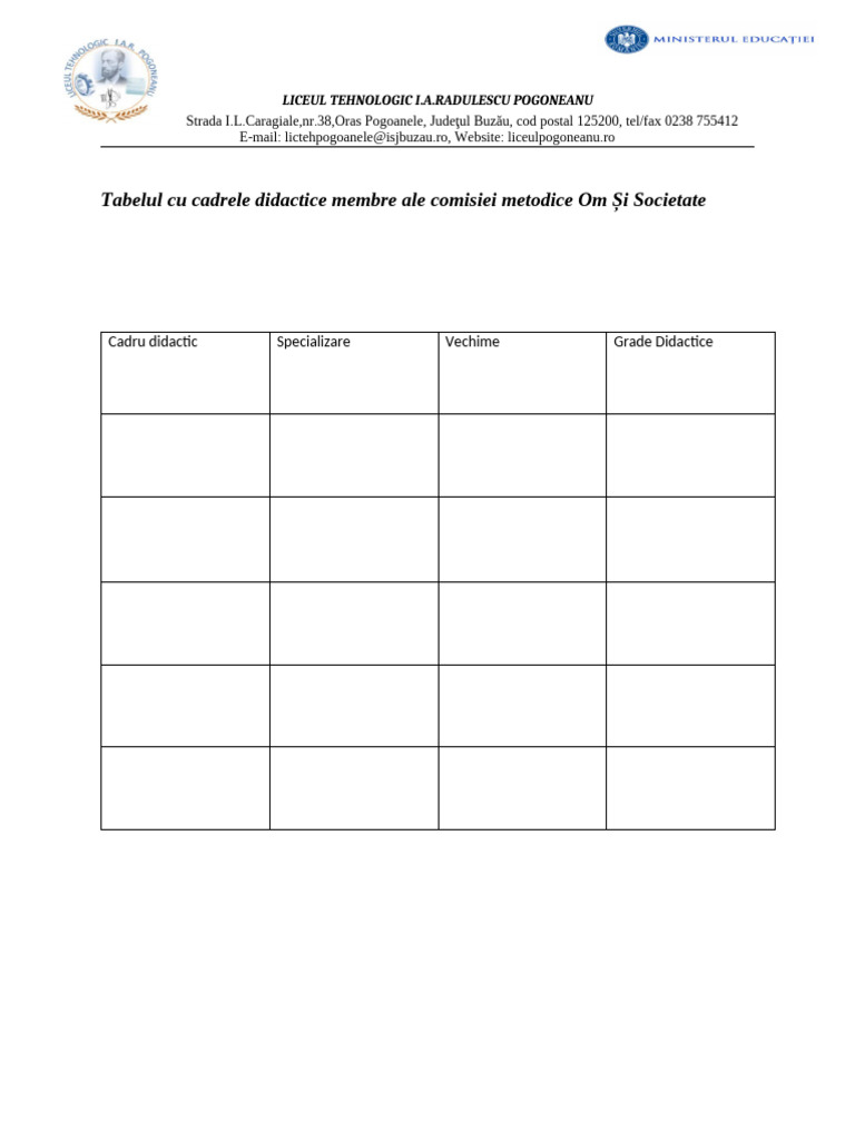 Tabelul cu cadrele didactice membre ale comisiei metodice Om Și Societate