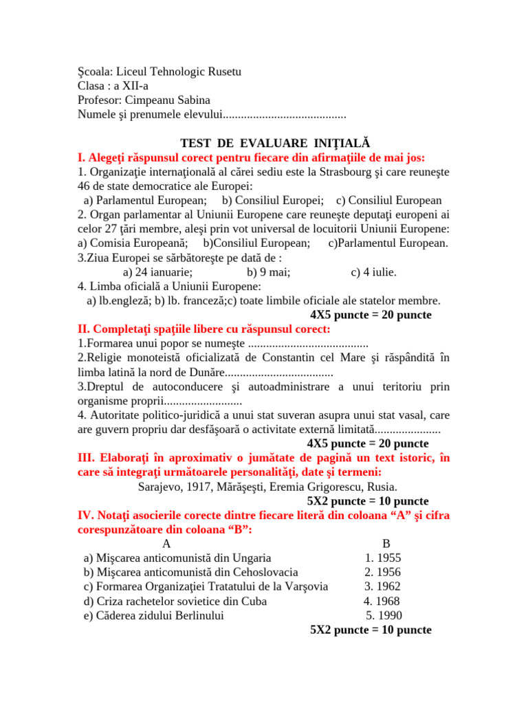 TEST DE EVALUARE INIŢIALĂ