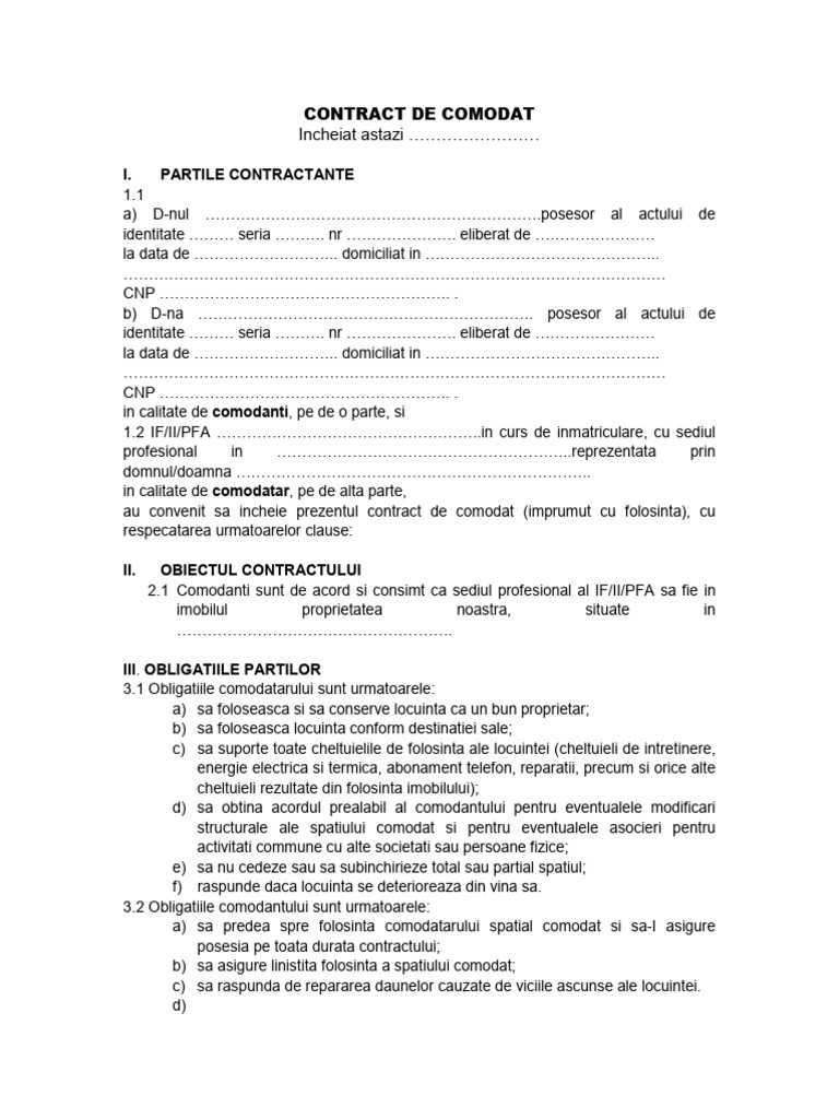 au convenit sa incheie prezentul contract de comodat (imprumut cu folosinta), cu