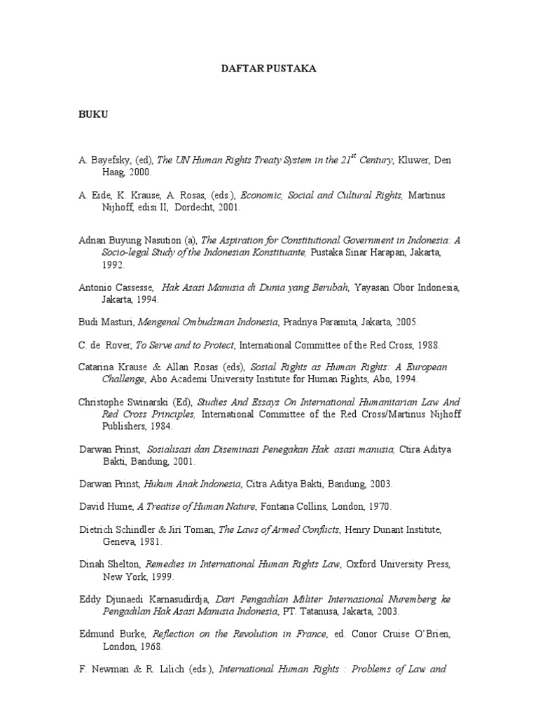 A. Bayefsky, (ed), The UN Human Rights Treaty System in the 21 Century, Kluwer, Den Haag, 2000. A. Eide, K. Krause, A. Rosas, (eds.), Economic, Social and Cultural Rights, Martinus Nijhoff, edisi II, Dordecht, 2001. Adnan Buyung Nasution (a), The Aspiration for Constitutional Government in Indonesia: A Socio-legal Study of the Indonesian Konstituante, Pustaka Sinar Harapan, Jakarta, 1992. Antonio Cassesse, Hak Asasi Manusia di Dunia yang Berubah, Yayasan Obor Indonesia, Jakarta, 1994. Budi Masturi, Mengenal Ombudsman Indonesia, Pradnya Paramita, Jakarta, 2005. C. de Rover, To Serve and to Protect, International Committee of the Red Cross, 1988. Catarina Krause & Allan Rosas (eds), Sosial Rights as Human Rights: A European Challenge, Abo Academi University Institute for Human Rights, Abo, 1994. Christophe Swinarski (Ed), Studies And Essays On International Humanitarian Law And Red Cross Principles, International Committee of the Red Cross/Martinus Nijhoff Publishers, 1984. Darwan Prinst, Sosialisasi dan Diseminasi Penegakan Hak asasi manusia, Ctira Aditya Bakti, Bandung, 2001. Darwan Prinst, Hukum Anak Indonesia, Citra Aditya Bakti, Bandung, 2003. David Hume, A Treatise of Human Nature, Fontana Collins, London, 1970. Dietrich Schindler & Jir Toman, The Laws of Armed Conflicts, Henry Dunant Institute, Geneva, 1981. Dinah Shelton, Remedies in International Human Rights Law, Oxford University Press, New York, 1999. Eddy Djunaedi Karnasudirdja, Dari Pengadilan Militer Internasional Nuremberg ke Pengadilan Hak Asasi Manusia Indonesia, PT. Tatanusa, Jakarta, 2003. Edmund Burke, Reflection on the Revolution in France, ed. Conor Cruise OBrien, London, 1968. F. Newman & R. Lilich (eds.), International Human Rights : Problems of Law and