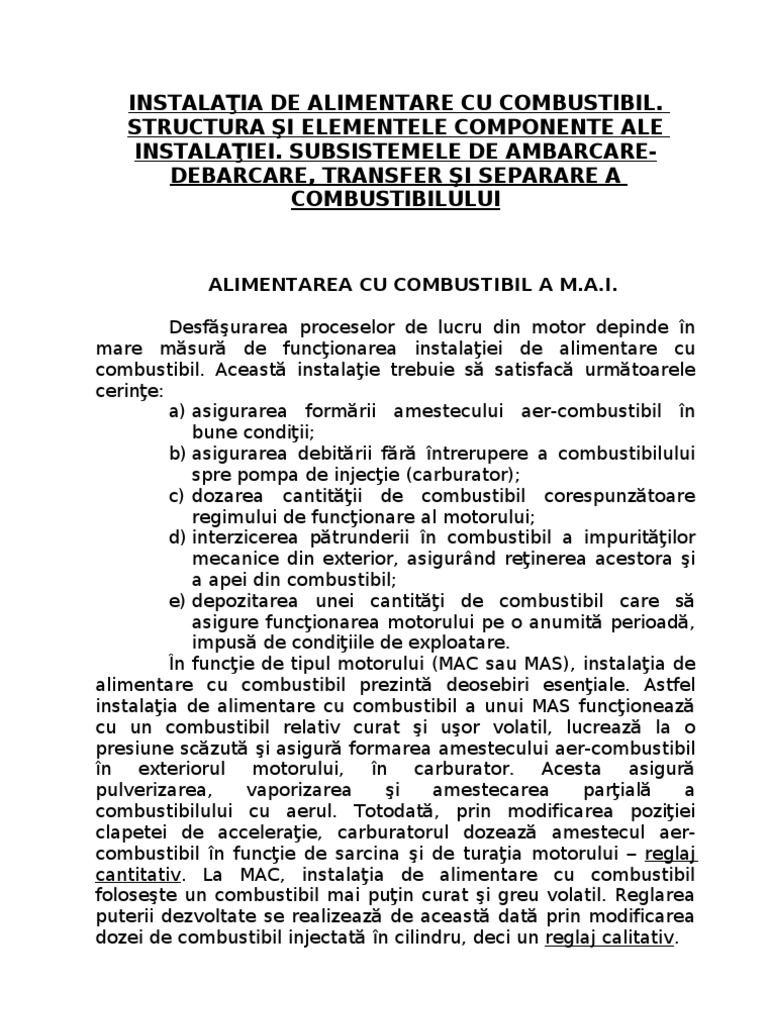 ALIMENTAREA CU COMBUSTIBIL A M.A.I. Desfurarea proceselor de lucru din motor depinde n mare msur de funcionarea instalaiei de alimentare cu combustibil. Aceast instalaie trebuie s satisfac urmtoarele cerine: a) asigurarea formrii amestecului aer-combustibil n bune condiii; b) asigurarea debitrii fr ntrerupere a combustibilului spre pompa de injecie (carburator); c) dozarea cantitii de combustibil corespunztoare regimului de funcionare al motorului; d) interzicerea ptrunderii n combustibil a impuritilor mecanice din exterior, asigurnd reinerea acestora i a apei din combustibil; e) depozitarea unei cantiti de combustibil care s asigure funcionarea motorului pe o anumit perioad, impus de condiiile de exploatare. n funcie de tipul motorului (MAC sau MAS), instalaia de alimentare cu combustibil prezint deosebiri eseniale. Astfel instalaia de alimentare cu combustibil a unui MAS funcioneaz cu un combustibil relativ curat i uor volatil, lucreaz la o presiune sczut i asigur formarea amestecului aer-combustibil n exteriorul motorului, n carburator. Acesta asigur pulverizarea, vaporizarea i amestecarea parial a combustibilului cu aerul. Totodat, prin modificarea poziiei clapetei de acceleraie, carburatorul dozeaz amestecul aercombustibil n funcie de sarcina i de turaia motorului reglaj cantitativ. La MAC, instalaia de alimentare cu combustibil folosete un combustibil mai puin curat i greu volatil. Reglarea puterii dezvoltate se realizeaz de aceast dat prin modificarea dozei de combustibil injectat n cilindru, deci un reglaj calitativ.