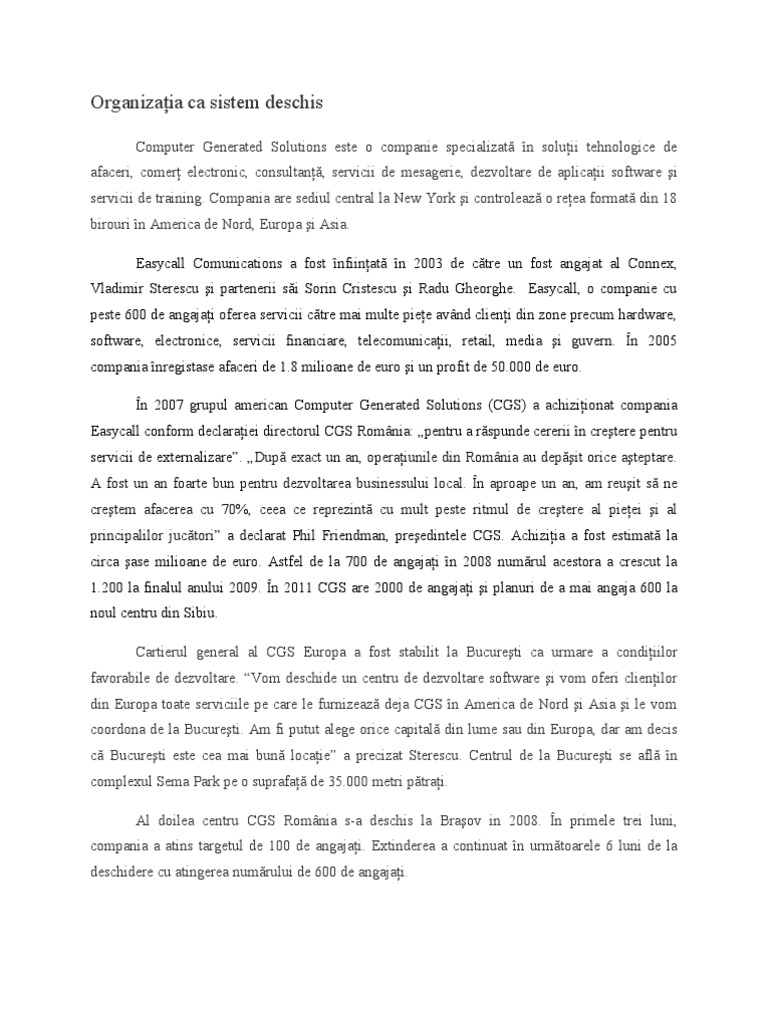 angajatului. Nemulumirile angajailor n ceea ce privete avansarea sau bonusurile au conduc la migrarea personalului foarte repede. Oportuniti (opportunities): Firmele strine sunt n cutare de externalizarea pentru reducerea costurilor. Creterea este att de mare nct CGS a ajuns la deschiderea a trei centre n Romnia. Ameninri (threats): Principala amentintare a CGS-ului sunt celelalte companii de outsourcing precum HP, Oracle, Microsoft. Majoritatea angajailor care pleac de la CGS se ndreapt nspre aceste firme datorit pachetului salarial mai atractiv, programului legal din Romnia, etc. Recomandarea mea ar fi ca managerii s ntocmeasc un plan de motivare a angajatului. Angajaii primesc continuu mailuri de la managerii din afar n care sunt felicitai pentru rezultatele bune pe care le au ns acest lucru nu se reflect nicieri altundeva. Motivarea nu trebuie neaprat s fie de natur financiar. Oferirea de noi provocri i oportuniti de dezvoltare i nvare este o alt posibil modalitate de motivare. Dar i aceasta trebuie tratat cu atenie deoarece ar putea s nu aib efectul dorit. Spre exemplu, ntr-un departament, din dorina de a crete productivitate ntregului proiect civa ageni au fost cross-trained, ocupanduse de dou departamente, cel primar n cursul sptmnii iar al doilea n week-end. Astfel agenii erau nevoii s vin i n week-end la munc. Soluia managementului a fost ca agenii s primeasc dou zile n cursul sptmnii pentru cele dou lucrate. La sfritul lunii fiecarei luni aceste ture coincid cu turele de overtime, n care agenii vin opional la munc i sunt pltii dublu. Deci cei care au mai mult responsabilitate i un volum mai mare de munc nu au primit nimic n plus la salariu.