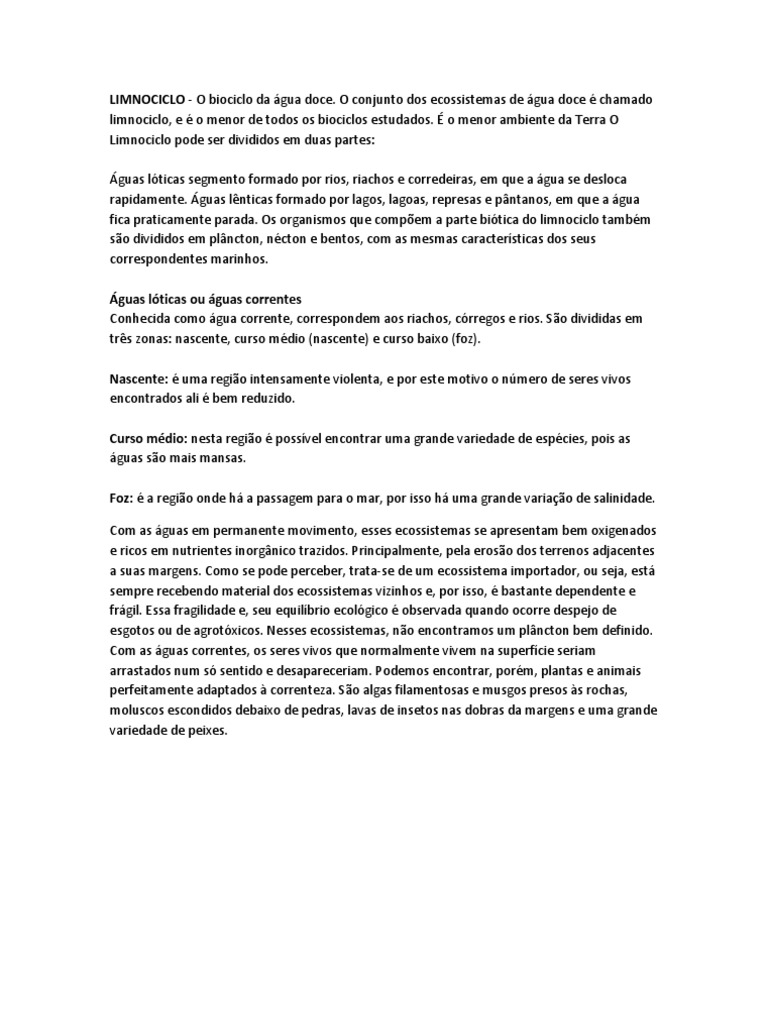 s. o menor ambiente da Terra O Limnociclo pode ser divididos em duas partes: guas lticas segmento formado por rios, riachos e corredeiras, em que a gua se desloca rapidamente. guas lnticas formado por lagos, lagoas, represas e pntanos, em que a gua fica praticamente parada. Os organismos que compem a parte bitica do limnociclo tambm so divididos em plncton, ncton e bentos, com as mesmas caractersticas dos seus correspondentes marinhos. guas lticas ou guas correntes Conhecida como gua corrente, correspondem aos riachos, crregos e rios. So divididas em trs zonas: nascente, curso mdio (nascente) e curso baixo (foz). Nascente: uma regio intensamente violenta, e por este motivo o nmero de seres vivos encontrados ali bem reduzido. Curso mdio: nesta regio possvel encontrar uma grande variedade de espcies, pois as guas so mais mansas. Foz: a regio onde h a passagem para o mar, por isso h uma grande variao de salinidade. Com as guas em permanente movimento, esses ecossistemas se apresentam bem oxigenados e ricos em nutrientes inorgnico trazidos. Principalmente, pela eroso dos terrenos adjacentes a suas margens. Como se pode perceber, trata-se de um ecossistema importador, ou seja, est sempre recebendo material dos ecossistemas vizinhos e, por isso, bastante dependente e frgil. Essa fragilidade e, seu equilbrio ecolgico observada quando ocorre despejo de esgotos ou de agrotxicos. Nesses ecossistemas, no encontramos um plncton bem definido. Com as guas correntes, os seres vivos que normalmente vivem na superfcie seriam arrastados num s sentido e desapareceriam. Podemos encontrar, porm, plantas e animais perfeitamente adaptados correnteza. So algas filamentosas e musgos presos s rochas, moluscos escondidos debaixo de pedras, lavas de insetos nas dobras da margens e uma grande variedade de peixes.