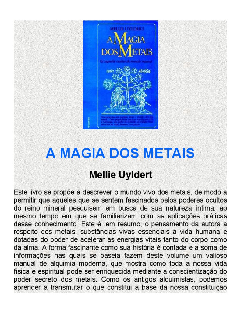 A MAGIA DOS METAIS Mellie Uyldert Este livro se prope a descrever o mundo vivo dos metais, de modo a permitir que aqueles que se sentem fascinados pelos poderes ocultos do reino mineral pesquisem em busca de sua natureza ntima, ao mesmo tempo em que se familiarizam com as aplicaes prticas desse conhecimento. Este , em resumo, o pensamento da autora a respeito dos metais, substncias vivas essenciais vida humana e dotadas do poder de acelerar as energias vitais tanto do corpo como da alma. A forma fascinante como sua histria contada e a soma de informaes nas quais se baseia fazem deste volume um valioso manual de alquimia moderna, que mostra como toda a nossa vida fsica e espiritual pode ser enriquecida mediante a conscientizao do poder secreto dos metais. Como os antigos alquimistas, podemos aprender a transmutar o que constitui a base da nossa constituio fsica em pura energia espiritual, de modo a completar a Grande Obra, sonho e objetivo de toda a cincia alqumica. De Melie Uyldert, a Editora Pensamento j editou A magia das pedras preciosas.