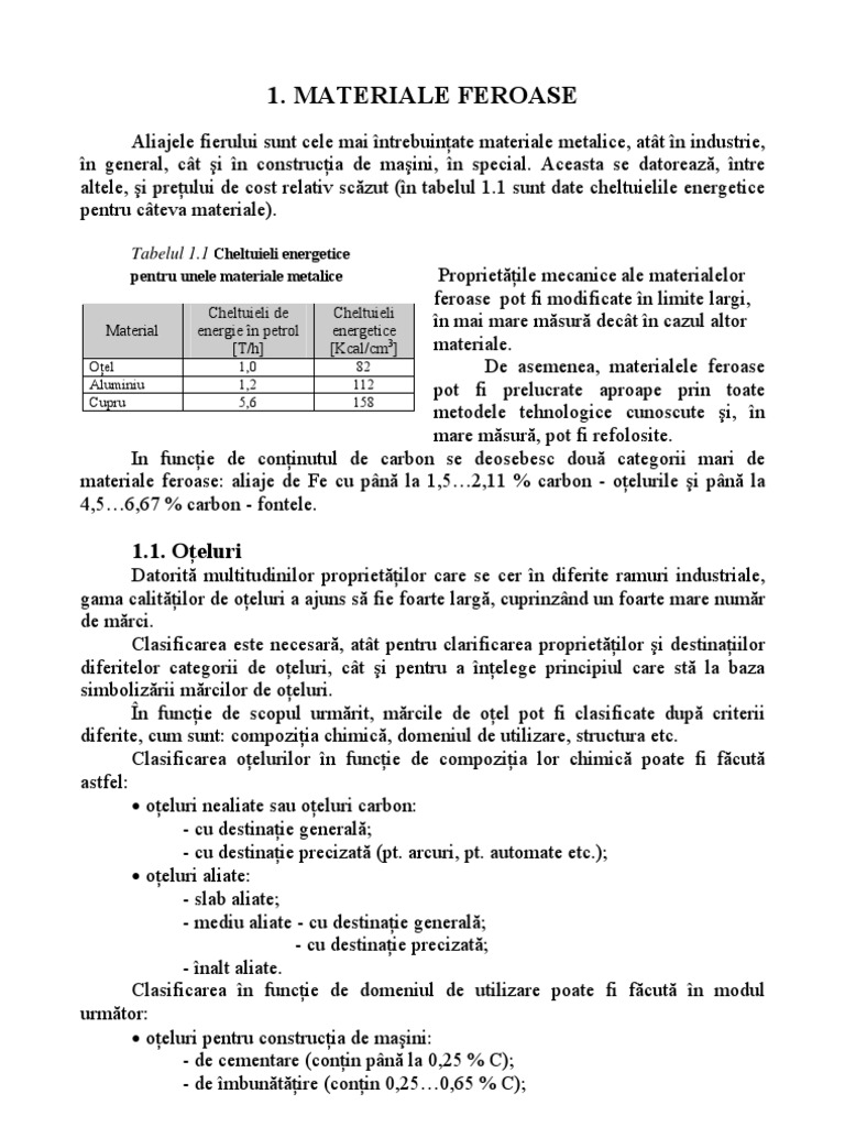 Proprietile mecanice ale materialelor feroase pot fi modificate n limite largi, Cheltuieli de Cheltuieli n mai mare msur dect n cazul altor Material energie n petrol energetice materiale. [T/h] [Kcal/cm3] Oel 1,0 82 De asemenea, materialele feroase Aluminiu 1,2 112 pot fi prelucrate aproape prin toate Cupru 5,6 158 metodele tehnologice cunoscute i, n mare msur, pot fi refolosite. In funcie de coninutul de carbon se deosebesc dou categorii mari de materiale feroase: aliaje de Fe cu pn la 1,52,11 % carbon - oelurile i pn la 4,56,67 % carbon - fontele.