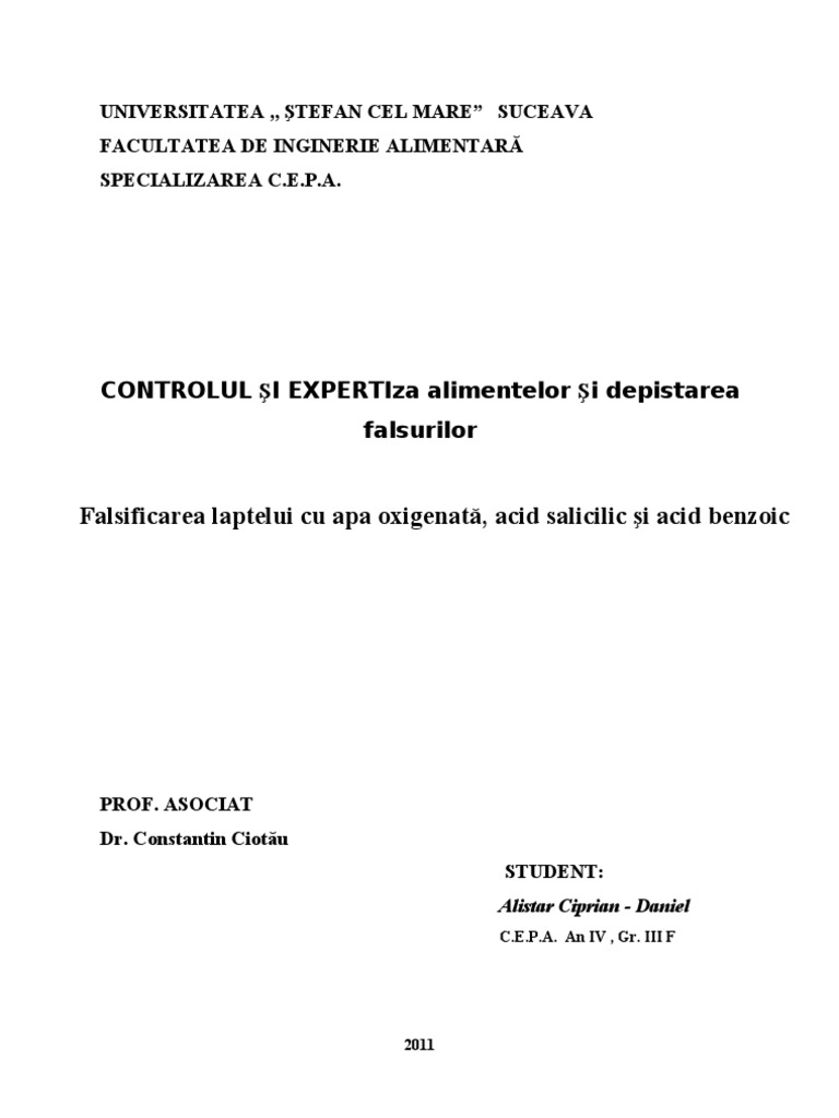 [Link]. 2 Rolul proteinelor, lipidelor i glucidelor..pag. 4 Rolul srurilor minerale i vitaminelor....pag. 5 Laptele aliment i medicament......pag. 7 Falsificarea laptelui cu substane conservante.....pag. 7 a) Falsificarea laptelui cu ap oxigenat...................................................pag. 8 b) Falsificarea laptelui cu acid salicilic .....pag. 9 c) Falsificarea laptelui cu acid benzoic i sarurile lui........pag. 9 Bibliografie