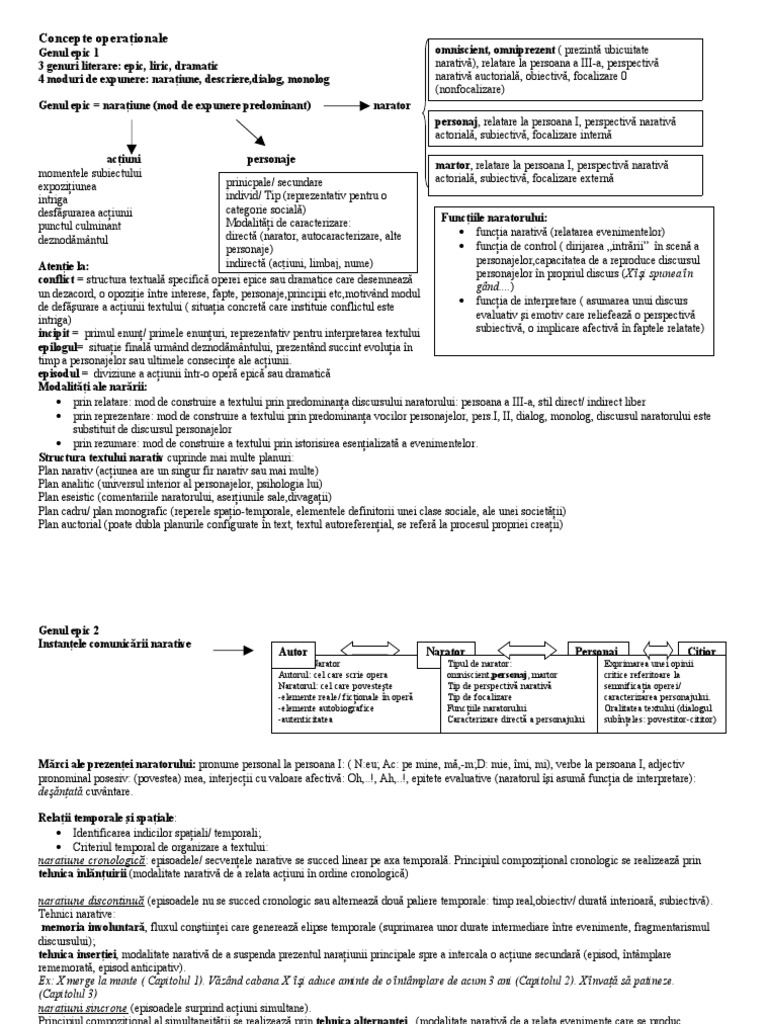 Genul epic 3 Structura textului narativ:Tem (subiectul operei) + Plan: narativ (momentele subiectului) + analitic + eseistic + cadru/ plan monografic Secven narativ: unitate de construcie a operei narative, reprezentativ pentru semnificaia textului Discurs narativ. Tzvetan Todorov considera c naraiunea implic dou elemente: -un scenariu narativ ( nlnuire de aciuni) -un discurs narativ (contrucia estetic a povestirii) care presupune o anumit compoziie ( un mod de organizare intern a textului): alctuire formal a textului (volume, capitole), formula narativ (n funcie de specia literar),criteriul temporal de organizare a textului, tehnici narative. Pauza descriptiv reprezint o secven textual constnd n substituirea discursului narativ cu unul figurativ, organizat tematic: peisaj,interior, obiect, tablou static/ dinamic sau personaj ( descriere-portret). Pauza descriptiv este asumat de narator/ personaj i suspend temporalitatea, fiind structurat mai ales spaial i sincronic. Descrierea poate fi obiectiv sau subiectiv. Personaje (Individ / Tip) Tipologie: reprezentare convenional a unei categorii umane (sociale sau psihologice). Personajul tipologic poate reprezenta: tipologii general-umane: avarul, ipocritul, fata btrn, naivul tipologii sociale:ranul, soldatul, intelectualul,artistul tipologii estetice: clasic, romantic,realist, modern, postmodern -caractere: personaje care au o trstur moral dominant: -personaj arhetipal: cu un grad mare de convenionalitate,reprezint un model originar,un erou exemplar, mitic: eroul salvator. -personaj simbolic: personaj semnificativ pentru o idee literar, cu semnificaii morale sau psihologice Funcii ale personajului: Funcie actanial (este un actant,ia parte la aciune) naratorul este omniscient Funcie de relatare (personajul relateaz ntmplri) naratorul poate fi omniscient sau personaj Funcie reflexiv, personajul observ, emite judeci de valoare, cugetri, n cadrul unui discurs asertiv ( aseriunea = afirmaie susinut ca fiind adevrat) sau n cadrul unui discurs apodictic [apodictic (despre judeci, demonstraii etc.) = care exprim raporturi i legturi necesare ntre lucruri sau fenomene; care exclude posibilitatea unei opoziii]. narator personaj sau martor Funcia de control (personajul citeaz discursul celorlalte personaje n propiul su discurs) naratorul personaj Mijloace de caracterizare: Portret literar= tip de discurs descriptiv care const n prezentarea unui personaj literar prin reliefarea elementelor definitorii (trsturi fizice, morale, psihice, model comportamental,raporturi cu alte personaje). Portretul poate fi: fizic moral (caliti sufleteti, defecte,sistemul de valori, principii. Este specific romanului tradiional, realist. psihic (caracteristici ale personalitii, aptitudini nnscute sau dobndite, tip de temperament [Link] specific romanului modern Funcii ale portretului: funcia de informare ( referenial) se realizeaz prin enumerarea caracteristicilor care permit identificarea, individualizarea i diferenierea unui personaj, funcia apare n portretul iniial al personajului. funcia anticipativ: serie de caracteristici care justific evoluia personajului funcie simbolic: n cazul personajelor care sunt purttoare ale unor valori etice,estetice, ontologice (n povestiri mitice). funcie asertiv: semnalizat prin indici ai implicrii afective (funcia de interpretare a naratorului)