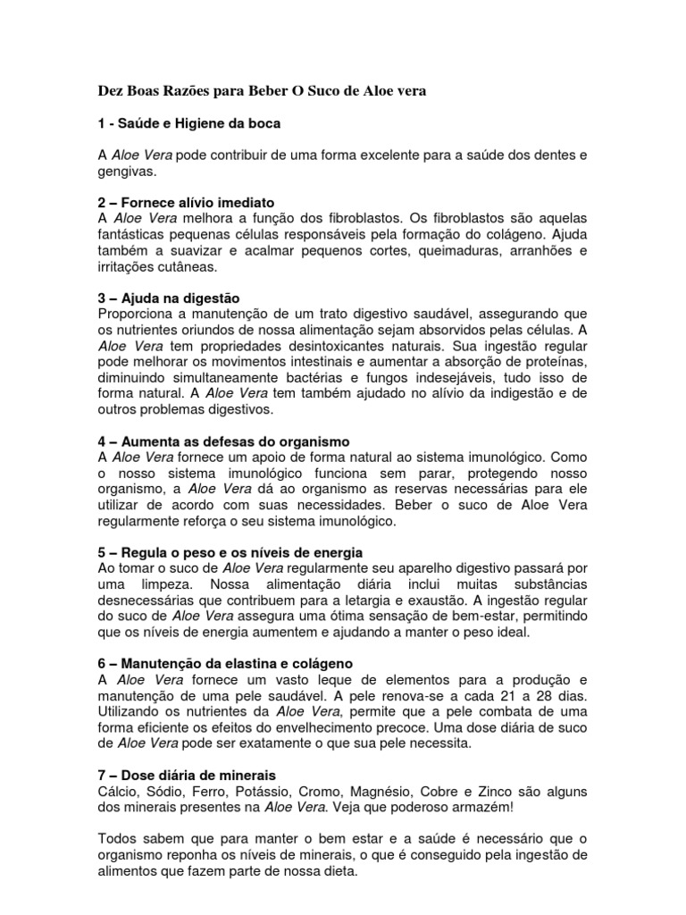 1 - Sade e Higiene da boca A Aloe Vera pode contribuir de uma forma excelente para a sade dos dentes e gengivas. 2 Fornece alvio imediato A Aloe Vera melhora a funo dos fibroblastos. Os fibroblastos so aquelas fantsticas pequenas clulas responsveis pela formao do colgeno. Ajuda tambm a suavizar e acalmar pequenos cortes, queimaduras, arranhes e irritaes cutneas. 3 Ajuda na digesto Proporciona a manuteno de um trato digestivo saudvel, assegurando que os nutrientes oriundos de nossa alimentao sejam absorvidos pelas clulas. A Aloe Vera tem propriedades desintoxicantes naturais. Sua ingesto regular pode melhorar os movimentos intestinais e aumentar a absoro de protenas, diminuindo simultaneamente bactrias e fungos indesejveis, tudo isso de forma natural. A Aloe Vera tem tambm ajudado no alvio da indigesto e de outros problemas digestivos. 4 Aumenta as defesas do organismo A Aloe Vera fornece um apoio de forma natural ao sistema imunolgico. Como o nosso sistema imunolgico funciona sem parar, protegendo nosso organismo, a Aloe Vera d ao organismo as reservas necessrias para ele utilizar de acordo com suas necessidades. Beber o suco de Aloe Vera regularmente refora o seu sistema imunolgico. 5 Regula o peso e os nveis de energia Ao tomar o suco de Aloe Vera regularmente seu aparelho digestivo passar por uma limpeza. Nossa alimentao diria inclui muitas substncias desnecessrias que contribuem para a letargia e exausto. A ingesto regular do suco de Aloe Vera assegura uma tima sensao de bem-estar, permitindo que os nveis de energia aumentem e ajudando a manter o peso ideal. 6 Manuteno da elastina e colgeno A Aloe Vera fornece um vasto leque de elementos para a produo e manuteno de uma pele saudvel. A pele renova-se a cada 21 a 28 dias. Utilizando os nutrientes da Aloe Vera, permite que a pele combata de uma forma eficiente os efeitos do envelhecimento precoce. Uma dose diria de suco de Aloe Vera pode ser exatamente o que sua pele necessita. 7 Dose diria de minerais Clcio, Sdio, Ferro, Potssio, Cromo, Magnsio, Cobre e Zinco so alguns dos minerais presentes na Aloe Vera. Veja que poderoso armazm! Todos sabem que para manter o bem estar e a sade necessrio que o organismo reponha os nveis de minerais, o que conseguido pela ingesto de alimentos que fazem parte de nossa dieta.