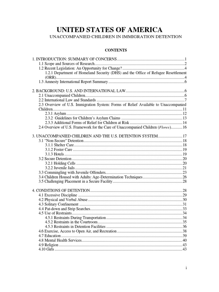 resolution of their immigration status in administrative proceedings before an immigration court within the Executive Office of Immigration Review (EOIR). The circumstances in which these children find themselves are complex and varied. Some may live in fear of persecution, civil unrest or human rights abuse in their home countries. Amnesty International has documented that around the world girls and boys are subjected to horrific violence and abuse. Children are tortured because they are caught up in wars and political conflict. Children are vulnerable to ill treatment by police and security forces, and are often detained in conditions that pose a threat to their health and safety. Many face being beaten or sexually abused by the very adults who are supposed to protect them. 5 Other children arriving in the U.S. may have been sent, willingly or otherwise, to secure what their parents or guardians perceive to be a better future in a more developed country. Irrespective of thei immigration r status, these children have special needs that must be met, needs and rights that are guaranteed under international laws and standards. According to the United Nations High Commissioner for Refugees (UNHCR), children seeking asylum, particularly if they are unaccompanied, are entitled to special care and protection. Unaccompanied children in the U.S. immigration system are routinely deprived of their rights in contravention of international and U.S. standards. Children should be confined and imprisoned only in exceptional circumstances or as a last resort, and then only for the shortest possible time. Unaccompanied children arriving in the U.S. are not only detained but are often held in facilities that routinely fail to adhere to both international and U.S. standards governing the detention of children. AI has documented violations of rights essential to protection from arbitrary detention, including access to counsel, to translators, and to telephones. Violations of the right to humane treatment have also been documented: some children may be housed alongside juvenile offenders, denied access to appropriate education and exercise, and may be subjected to punitive and degrading treatment including the excessive use of shackles and restraints and routine strip searches. Freedom from arbitrary detention is a fundamental human right. The system of determining whether a child should be held in a secure or non-secure facility and whether a child should remain in detention is fraught with difficulties and inconsistencies, and in some cases may amount to arbitrary detention. The decision to continue to detain a child may rest on factors such as whether a parent has appropriate immigration status in the United States, the availability of detention spaces, the attitude of the official involved, or an arbitrary and unreviewed decision that a child is a flight risk. Unlike the criminal justice system, children deprived of their liberty in the immigration system are not guaranteed legal representation even though important rights are at stake; less than half of unaccompanied children have legal counsel to represent them in an immigration court. Unaccompanied children are a vulnerable population with complex needs; they are often confused and alone, yet U.S. immigration laws, practices, and procedures do not significantly distinguish children and adults. There is currently no system in place in the U.S. to ensure the appointment of a guardian ad litem (friend of the child), who in the absence of a traditional caregiver acts to ensure that all decisions are taken with a childs best interests in mind. 1.1 Scope and Sources of Research