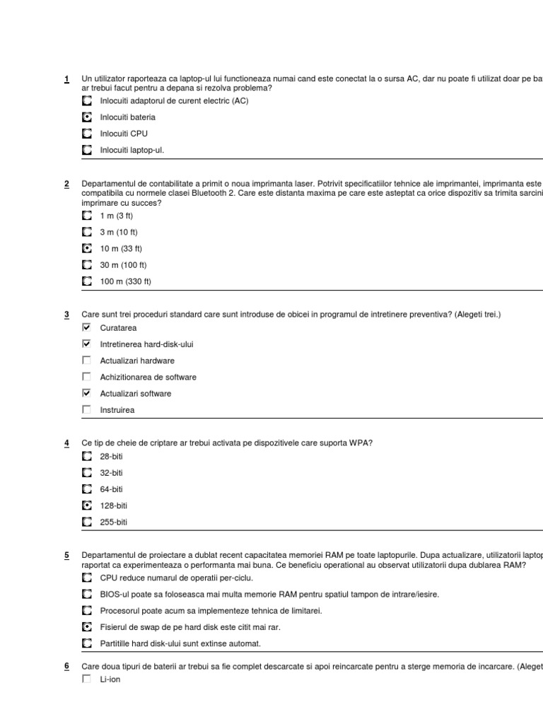 Departamentul de proiectare a dublat recent capacitatea memoriei RAM pe toate laptopurile. Dupa actualizare, utilizatorii laptop raportat ca experimenteaza o performanta mai buna. Ce beneficiu operational au observat utilizatorii dupa dublarea RAM? CPU reduce numarul de operatii per-ciclu. BIOS-ul poate sa foloseasca mai multa memorie RAM pentru spatiul tampon de intrare/iesire. Procesorul poate acum sa implementeze tehnica de limitarei. Fisierul de swap de pe hard disk este citit mai rar. Partitille hard disk-ului sunt extinse automat.