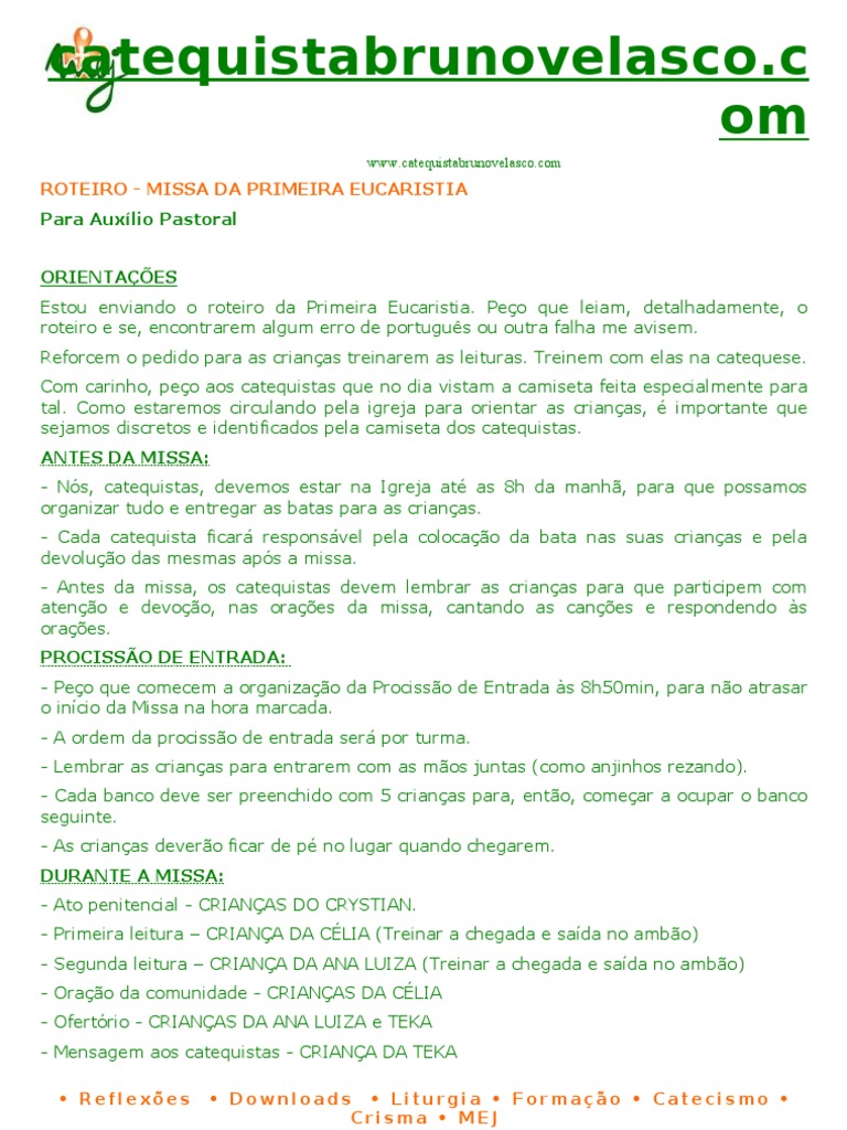 ROTEIRO - MISSA DA PRIMEIRA EUCARISTIA Para Auxlio Pastoral ORIENTAES Estou enviando o roteiro da Primeira Eucaristia. Peo que leiam, detalhadamente, o roteiro e se, encontrarem algum erro de portugus ou outra falha me avisem. Reforcem o pedido para as crianas treinarem as leituras. Treinem com elas na catequese. Com carinho, peo aos catequistas que no dia vistam a camiseta feita especialmente para tal. Como estaremos circulando pela igreja para orientar as crianas, importante que sejamos discretos e identificados pela camiseta dos catequistas. ANTES DA MISSA: - Ns, catequistas, devemos estar na Igreja at as 8h da manh, para que possamos organizar tudo e entregar as batas para as crianas. - Cada catequista ficar responsvel pela colocao da bata nas suas crianas e pela devoluo das mesmas aps a missa. - Antes da missa, os catequistas devem lembrar as crianas para que participem com ateno e devoo, nas oraes da missa, cantando as canes e respondendo s oraes. PROCISSO DE ENTRADA: - Peo que comecem a organizao da Procisso de Entrada s 8h50min, para no atrasar o incio da Missa na hora marcada. - A ordem da procisso de entrada ser por turma. - Lembrar as crianas para entrarem com as mos juntas (como anjinhos rezando). - Cada banco deve ser preenchido com 5 crianas para, ento, comear a ocupar o banco seguinte. - As crianas devero ficar de p no lugar quando chegarem. DURANTE A MISSA: - Ato penitencial - CRIANAS DO CRYSTIAN. - Primeira leitura CRIANA DA CLIA (Treinar a chegada e sada no ambo) - Segunda leitura CRIANA DA ANA LUIZA (Treinar a chegada e sada no ambo) - Orao da comunidade - CRIANAS DA CLIA - Ofertrio - CRIANAS DA ANA LUIZA e TEKA - Mensagem aos catequistas - CRIANA DA TEKA Reflexes Downloads Liturgia Formao Catecismo Crisma MEJ