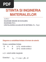 -monofazici: soluii solide, compui chimici, compui intermetalici, -polifazici: amestec mecanic. Reprezentarea grafic a strii de echilibru a unui aliaj cu doi componeni, const ntr-o vertical care indic temperatura i pe care sunt nscrise punctele critice (temperaturile la care se produc transformri). Dac pentru un sistem de aliaje formate din doi componeni, reprezentm ntr-un sistem de coordonate temperatura-concentraie, toate punctele critice corespunztoare tuturor aliajelor sistemului, obinem, diagrama de echilibru a sistemului de aliaje respectiv (un sistem de curbe i cmpuri n cele dou coordonate). Aliajele Fe-C au diagrama de echilibru sub dou aspecte : -diagrama fier-cementit (echilibru metastabil) i este reprezentat cu line continu . -diagrama fier-grafit (echilibru stabil) i este reprezentat cu linie ntrerupt. Sistemul de aliaje fier-carbon prezint urmtorii constitueni structurali: Ferita sau soluia solid , este o soluie solid interstiial a carbonului n Fe. Ferita dizolv carbonul n cantitate foarte mic (0,006 %C la temperatura mediului ambiant i 0,02%C la 727C). Faza este o parte omogen (din punct de vedere fizico-chimic) a unui sistem, mrginit de o alta parte omogen (faza ) printr-o suprafa de separare . Ferita este un constituent moale (80 [HB]), plastic i apare la microscop de culoare deschis . Austenita sau soluia solid este o soluie solid interstiiala a carbonului n Fe . Ea dizolv max. 2,11%C la 1148 C, iar la 727 C dizolv 0,77%C. Austenita este paramagnetic i n mod normal este stabil la temperaturi nalte ns, poate fi ntlnit i la temperatura ambiant n oeluri aliate. Ea este moale i plastic. Cementita (Fe3C) este un compus chimic cu 6,67% C, dur (800HB) rezistent la aciunea reactivilor metalografici. La microscop apare de culoare alb (atac cu nital); meninut timp ndelungat la temperatur ridicat, se descompune n grafit i ferit. Cementita apare sub trei forme diferite: -cementita primar se formeaz n urma cristalizrii primare din topitur (linia CD); -cementita secundar precipit din austenit (linia SE,EC); -cementita teriar precipit din ferit (linia PQ). Perlita sau eutectoidul diagramei Fe-Fe3C, conine 0,77% C i este un amestec mecanic de ferit si cementit. Proprietile mecanice ale perlitei snt intermediare ntre cele ale feritei i cementitei. Se poate prezenta sub dou forme : lamelar i globular. Ledeburita sau eutecticul diagramei Fe-Fe3C conine 4,3% C i este un amestec mecanic ntre austenit si cementit, ntre 727-1148C i ntre perlita i cementit, sub 727C. n cea ce privete proprietile mecanice, este dur 100HB i fragil, la microscop are un aspect zebrat sau punctiform. Grafitul apare n structura fontelor i este constituit din carbon pur. El este un constituent moale, fr rezistent mecanic.