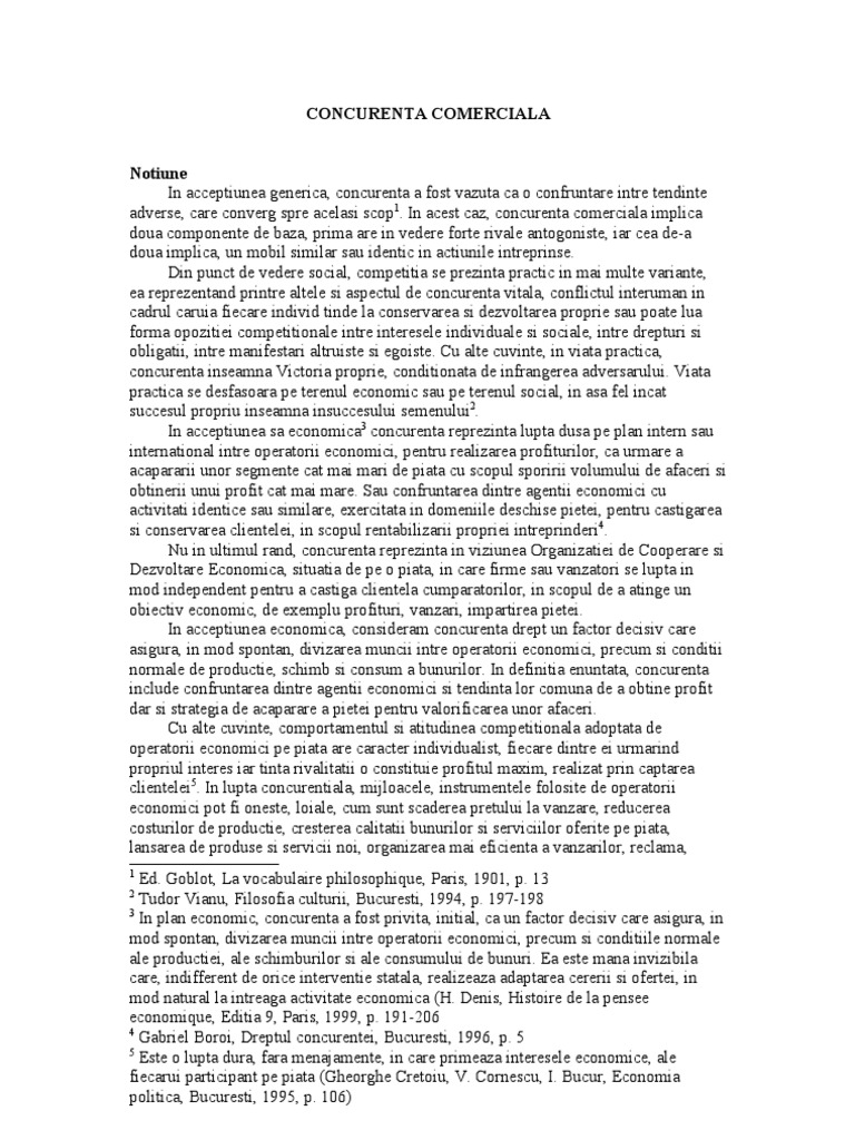 Ed. Goblot, La vocabulaire philosophique, Paris, 1901, p. 13 Tudor Vianu, Filosofia culturii, Bucuresti, 1994, p. 197-198 3 In plan economic, concurenta a fost privita, initial, ca un factor decisiv care asigura, in mod spontan, divizarea muncii intre operatorii economici, precum si conditiile normale ale productiei, ale schimburilor si ale consumului de bunuri. Ea este mana invizibila care, indifferent de orice interventie statala, realizeaza adaptarea cererii si ofertei, in mod natural la intreaga activitate economica (H. Denis, Histoire de la pensee economique, Editia 9, Paris, 1999, p. 191-206 4 Gabriel Boroi, Dreptul concurentei, Bucuresti, 1996, p. 5 5 Este o lupta dura, fara menajamente, in care primeaza interesele economice, ale fiecarui participant pe piata (Gheorghe Cretoiu, V. Cornescu, I. Bucur, Economia politica, Bucuresti, 1995, p. 106)