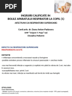 * etiologie : a) factori determinanti : -virusurile : peste 200 dar princip ag etiol sunt rinovir, cornav, adenov, VSR, [Link] si paragrip. [Link] (5-8 infectii /an in primii 2 ani de viata) -bacteriile , rar in std initial, se pot grefa pe terenul preg de virus b) factori favorizanti : -varsta mica, malnutr, terenul exud, limf, atopic, deficit imun tranzitor, malf locale, hipertrof veget aden, RGE, infectii cr, anotimp rece, igiena * tablou clinic : -debut cu febra 38-39 sau hipertermie maligna, precedata de agitatie, inapetenta, stranut, frisoane -perioada de stare : in cateva ore -semne generale :sdr. Obstructiv cu resp zgomotoasa, orala * la sugar : somn agitat, febra 1-3 zile, supt dificil (nu poate resp pe nas), scad pond, tuse iritativa uscata, frecv mai ales dim, vars si sc diar * la copil mare : uscaciunea mucoasei naz si faringe, disfagie, tuse irit, emetizanta, stranut, cefalee, mialgii -semne locale : (exam ORL) - rinoree, narina si buze sup tumefiate, congest, uneori cu escoriatii ; la sugar rinoreea lipseste, secr nasofaring se preling post datorita pozitiei declive ; ggl mariti de volum * exam faringelui evident congest pilierilor, a val palatin, a luetei si per post faring, obs a secr vascoasa, mucopur sau mici vezicule herpetiform inconj de o areola rosie, indicand etiologia virala (herpangina cu [Link]) -la nou-nascut, in primele 10-15 zile de viata, rinofaringita poat determ sdr de IR acuta grava cu polipnee si cianoza periorala deoarece acesta nu stie sa respire pe gura - diagnostic pozitiv : anamneza + tabloun clinic +examen ORL