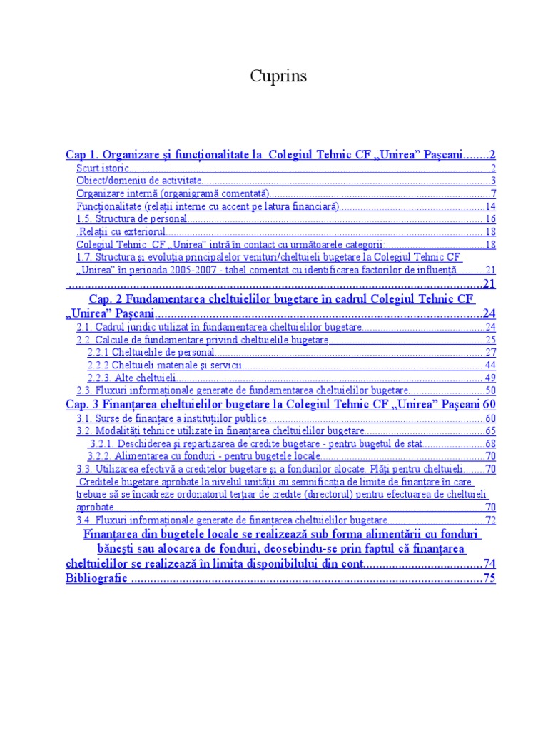 ................................................................................................................................21 Cap. 2 Fundamentarea cheltuielilor bugetare n cadrul Colegiul Tehnic CF Unirea Pacani.....................................................................................................24