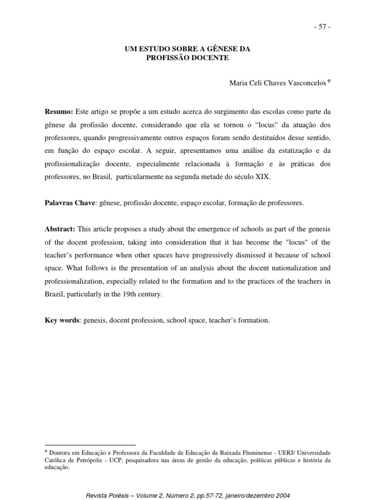 Resumo: Este artigo se prope a um estudo acerca do surgimento das escolas como parte da gnese da profisso docente, considerando que ela se tornou o locus da atuao dos professores, quando progressivamente outros espaos foram sendo destitudos desse sentido, em funo do espao escolar. A seguir, apresentamos uma anlise da estatizao e da profissionalizao docente, especialmente relacionada formao e s prticas dos professores, no Brasil, particularmente na segunda metade do sculo XIX.