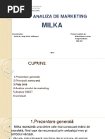 Macromediul firmei Macromediul firmei este alcatuit din acei factori de mediu care influenteazaindirect activitatea firmei, dar care creaza ocazii favorabile sau pot ameninta obiectivelesi activitatea unei firme. Macromediul cuprinde: factori economici, tehnologici, socio-culturali, demografici, ecologici, legislativi si politici. Macromediul brandului Milka este influentat de urmatorii factori: Factori socio-culturali: Ciocolata Milka se adreseaza tuturor persoanelor, mai putincelor care au probleme de sanatate (diabet zaharat), bebelusilor si copiilor foarte mici,indiferent de sex, ocupatie, venituri, [Link] ceea e priveste religia exista anumite restrictiiin perioada postului la ortodocsi nu poate fi consumata ciocolata cu lapte Factori economici. Deoarece pretul ciocolatii Milka variaza intre 10 lei si 100 lei aceasta poate fi cumparata de persoane cu venituri medii si mari. Factori tehnologici . Odata cu dezvoltarea tehnologiei s-au creat noi moduri de a satisfacenevoile clientilor nostri, cel mai bun exemplu este imbunatatirea ofertei de produs si inovarea portofoliului. Rebranding-ul a vizat si portofoliul de praline Milka (I love Milka), care asuferit o transformare la nivel de design de ambalaj, in linie cu noua imagine a brand-ului. Factori legislativi: