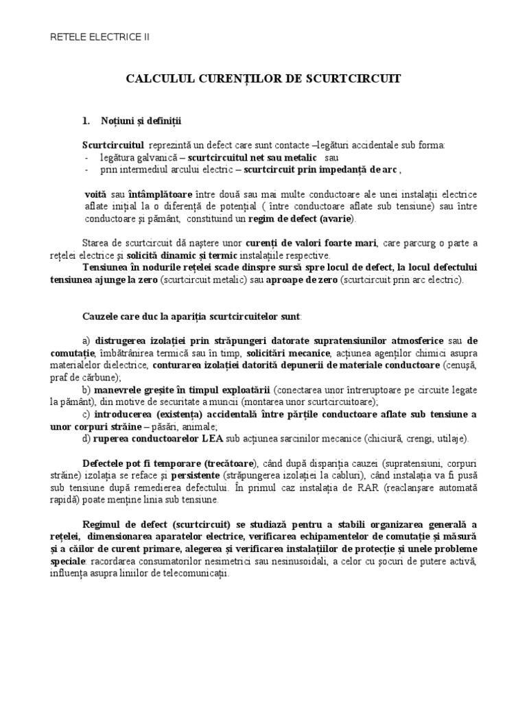 Scurtcircuitul reprezint un defect care sunt contacte legturi accidentale sub forma: - legtura galvanic scurtcircuitul net sau metalic sau - prin intermediul arcului electric scurtcircuit prin impedan de arc , voit sau ntmpltoare ntre dou sau mai multe conductoare ale unei instalaii electrice aflate iniial la o diferen de potenial ( ntre conductoare aflate sub tensiune) sau ntre conductoare i pmnt, constituind un regim de defect (avarie). Starea de scurtcircuit d natere unor cureni de valori foarte mari, care parcurg o parte a reelei electrice i solicit dinamic i termic instalaiile respective. Tensiunea n nodurile reelei scade dinspre surs spre locul de defect, la locul defectului tensiunea ajunge la zero (scurtcircuit metalic) sau aproape de zero (scurtcircuit prin arc electric). Cauzele care duc la apariia scurtcircuitelor sunt: a) distrugerea izolaiei prin strpungeri datorate supratensiunilor atmosferice sau de comutaie, mbtrnirea termic sau n timp, solicitri mecanice, aciunea agenilor chimici asupra materialelor dielectrice, conturarea izolaiei datorit depunerii de materiale conductoare (cenu, praf de crbune); b) manevrele greite n timpul exploatrii (conectarea unor ntreruptoare pe circuite legate la pmnt), din motive de securitate a muncii (montarea unor scurtcircuitoare); c) introducerea (existena) accidental ntre prile conductoare aflate sub tensiune a unor corpuri strine psri, animale; d) ruperea conductoarelor LEA sub aciunea sarcinilor mecanice (chiciur, crengi, utilaje). Defectele pot fi temporare (trectoare), cnd dup dispariia cauzei (supratensiuni, corpuri strine) izolaia se reface i persistente (strpungerea izolaiei la cabluri), cnd instalaia va fi pus sub tensiune dup remedierea defectului. n primul caz instalaia de RAR (reaclanare automat rapid) poate menine linia sub tensiune. Regimul de defect (scurtcircuit) se studiaz pentru a stabili organizarea general a reelei, dimensionarea aparatelor electrice, verificarea echipamentelor de comutaie i msur i a cilor de curent primare, alegerea i verificarea instalaiilor de protecie i unele probleme speciale: racordarea consumatorilor nesimetrici sau nesinusoidali, a celor cu ocuri de putere activ, influena asupra liniilor de telecomunicaii.