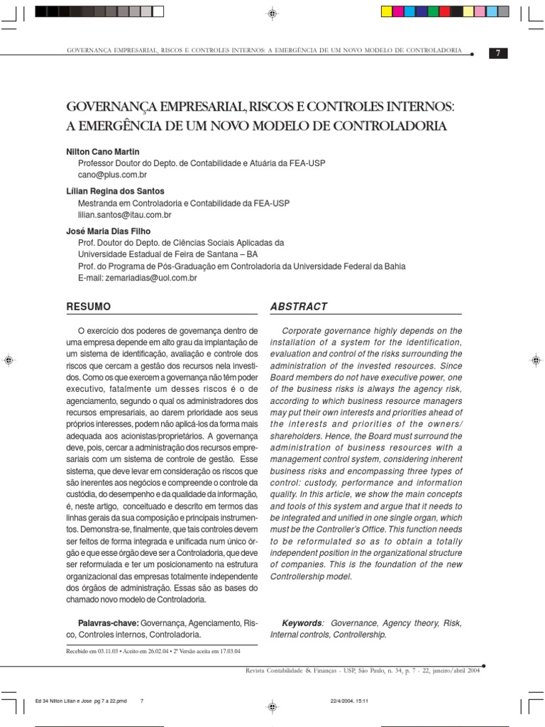 O exercício dos poderes de governança dentro de uma empresa depende em alto grau da implantação de um sistema de identificação, avaliação e controle dos riscos que cercam a gestão dos recursos nela investi- dos. Como os que exercem a governança não têm poder executivo, fatalmente um desses riscos é o de agenciamento, segundo o qual os administradores dos recursos empresariais, ao darem prioridade aos seus próprios interesses, podem não aplicá-los da forma mais adequada aos acionistas/proprietários. A governança deve, pois, cercar a administração dos recursos empre- sariais com um sistema de controle de gestão. Esse sistema, que deve levar em consideração os riscos que são inerentes aos negócios e compreende o controle da custódia, do desempenho e da qualidade da informação, é, neste artigo, conceituado e descrito em termos das linhas gerais da sua composição e principais instrumen- tos. Demonstra-se, finalmente, que tais controles devem ser feitos de forma integrada e unificada num único ór- gão e que esse órgão deve ser a Controladoria, que deve ser reformulada e ter um posicionamento na estrutura organizacional das empresas totalmente independente dos órgãos de administração. Essas são as bases do chamado novo modelo de Controladoria.