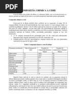1.4.1. Culoarea cerii Culoarea cerii este in strinsa dependenta de natura hranei albinelor, gradul de prospetime al fagurilor, metoda de extractie, cat si de prezenta si cantitatea de substante colorante din [Link] functie de acesti factori, culoarea poate fi diferita: de la alba-uniform in toata masa, in cazul fagurilor proaspeti, pana la galbena spre bruna-inchis la fagurii vechi sau la ceara obtinuta din reziduuri de faguri presati la cald sau prin extractia acestora cu solventi. 1.4.2. Structura Structura se apreciaza in spartura. Ceara de albina prezinta o structura microcristalina, cu granulatie mai mult sau mai putin fina. Ceara fiind o substanta complexa din punct de vedere chimic, ea cristalizeaza in agregate de forme neregulate. Daca in ceara solidificata moleculele sunt repartizate intr-o anumita ordine, in ceara lichida se afla intr-o pozitie dezordonata sub actiunea miscarii termice. 1.4.3. Mirosul cerii Mirosul cerii trebuie sa fie placut,fara nuante straine. La calitatatile superioara si I este specific, placut, asemanator mierii incalzite, in timp ce la calitatea a II-a ai a III-a mirosul este influentat de procedeul de extractie folosit. Ceara falsificata prezinta in general miros strain. 1.4.4. Gustul cerii. Se apreciaza muscand o bucata de ceara. Ceara curata este aproape lipsita de gust, iar cea cu adausuri are gust strain sau ranced, iar daca se lipeste de dinti contine seu sau rasini. 1.4.5. Puritatea cerii Puritatea cerii se recunoaste prin aparitia unei pudre asemanatoare unei brume albicioase cunoscuta sub denumirea de floare de ceara. 1.4.6. Consistenta Consistenta se apreciaza dupa aspectul cerii framantate trase in fire sau presate in foi subtiri. Ceara pura framantata usor devine plastica, putin lucioasa, nu murdareste degetele, trasa in foi subtiri este uniforma,fara luciu,iar in fire subtiri nu se alungeste. Potrivita, in ansamblu, ceara apare ca un corp tare (solid), cu structura granuloasa. La temperatura de 20 C consistenta acesteia devine plastica, fara luciu pronuntat, putin lucioasa, iar la taiere se rupe neregulat. 1.4.7. Punctul de topire. Ceara in solzisori se topeste la 72C, ceara rezultata din faguri se topeste la 62-65C, iar ceara extrasa cu solventi se topeste la 67- 71C.