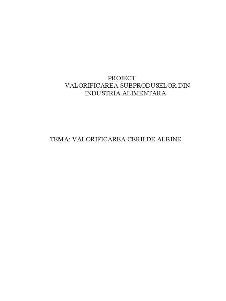 CEARA DE ALBINE..............................................................................................................2 1.1. PREGATIREA MATERIEI PRIME SI EXTRACTIA CERII DE ALBINE..............3 1.2. CLASIFICARE CERII EXTRASE..............................................................................4 1.2.1. Ceara de stupina ....................................................................................................5 1.2.2. Ceara de bostina.....................................................................................................5 1.2.3. Ceara extrasa cu ajutorul solventilor.....................................................................5 1.3. CONDITIONAREA CERII EXTRASE.......................................................................5 1.3.1. Rafinarea (limpezirea) cerii...................................................................................6 1.4.1. Culoarea cerii ........................................................................................................7 1.4.2. Structura.................................................................................................................7 1.4.3. Mirosul cerii ..........................................................................................................7 1.4.5. Puritatea cerii.........................................................................................................7 1.4.6. Consistenta.............................................................................................................7 1.4.12. Elasticitatea cerii .................................................................................................8 1.4.14. Compozitia chimica a cerii..................................................................................8 1.5. UTILIZAREA CEREI DE ALBINE IN DIFERITE DOMENII.............................8 2. BIBLIOGRAFIE................................................................................................................10