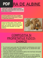 Tinand seama ca ceara de albine este folosita in continuare in diferite scopuri, ea poate fi supusa mai departe unor procedee de purificare si de albire care se executa in interprinderi specializate sub control rigurios. 1.3.1. Rafinarea (limpezirea) cerii Se poate face cu mijloace gospodaresti sau pe cale [Link] cale gospodareasca, rafinarea se face prin topiri repetate ale cerii in apa normala sau dedurizata, la temperatura de maxim 90 C. Dupa fiecare topire, ceara se raceste lent, in 1-5 zile, formandu-se in cele din urma un bloc de ceara; partea inferioara a blocului de ceara se inlatura, deoarece contine impuritati care depreciaza calitatea cerii. Rafinarea industriala a cerii se efectueaza cu ajutorul unor filtre centrifugale de carbune. In functie de destinatia folosirii cerii, culoarea acesteia trebuie sa fie galbena, sau chiar mai mult, pigmentii sa fie eliminati in totalitate mai ales cand este folosita in cosmetica si farmacie. Obtinerea cerii albe se realizeaza prin expunerea cerii la soare, rafinarea cu pamanturi decolorante si pe carbuni activati(ca metode fizice) si tratarea cu bioxid de sulf (metoda chimica) 1.3.2. Omogenizarea cerii. Consta in amestecul diferitelor loturi de ceara de aceeasi calitate, dar de provenienta diferita si care se topesc impreuna. 1.3.3. Corectarea culorii. Se realizeaza cu bicarbonat de sodiu, anhidrida sulfurica, perhidrol si acid sulfuric. Aceste substante, introduse in ceara topita la temperatura de 80 C, o decoloreaza pana la nunanta de galben-deschis sau alb. 1.3.4. Pastrarea si livrarea cerii. Se face in incaperi uscate, curate, fara mirosuri straine. Dupa proprietarile organoleptice, ceara de albine conditionata se livreaza in patru clase de calitate, astfel: Calitatea superioara: cuprinde ceara de culoare alba care provine din topirea fagurilor ramelor claditoare in care nu s-a crescut puiet. Calitatea I: ceara de culoare galbena care provine din topirea fagurilor proaspeti si a capacelelor acestora in care s-a crescut puiet. Calitatea a II-a: ceara are culoarea galbena, bruna-deschis, cenusie-deschis, fara luciu, usor lipicioasa si care provine din topirea faguriolor vechi. Calitatea a III-a: ceara este neuniform colorata, de la galbena-portocalie pana la brunainchis si provine din bostina prin presare sau solvatare.