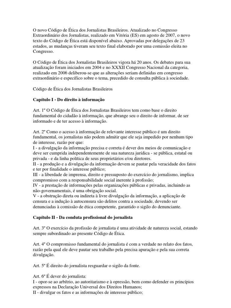 Atualizado no Congresso Extraordinrio dos Jornalistas, realizado em Vitria (ES) em agosto de 2007, o novo texto do Cdigo de tica est disponvel abaixo. Aprovadas por delegaes de 23 estados, as mudanas tiveram seu texto final elaborado por uma comisso eleita no Congresso. O Cdigo de tica dos Jornalistas Brasileiros vigora h 20 anos. Os debates para sua atualizao foram iniciados em 2004 e no XXXII Congresso Nacional da categoria, realizado em 2006 deliberou-se que as alteraes seriam definidas em congresso extraordinrio e especfico sobre o tema, precedido de consulta pblica sociedade. Cdigo de tica dos Jornalistas Brasileiros Captulo I - Do direito informao Art. 1 O Cdigo de tica dos Jornalistas Brasileiros tem como base o direito fundamental do cidado informao, que abrange seu o direito de informar, de ser informado e de ter acesso informao. Art. 2 Como o acesso informao de relevante interesse pblico um direito fundamental, os jornalistas no podem admitir que ele seja impedido por nenhum tipo de interesse, razo por que: I - a divulgao da informao precisa e correta dever dos meios de comunicao e deve ser cumprida independentemente de sua natureza jurdica - se pblica, estatal ou privada - e da linha poltica de seus proprietrios e/ou diretores. II - a produo e a divulgao da informao devem se pautar pela veracidade dos fatos e ter por finalidade o interesse pblico; III - a liberdade de imprensa, direito e pressuposto do exerccio do jornalismo, implica compromisso com a responsabilidade social inerente profisso; IV - a prestao de informaes pelas organizaes pblicas e privadas, incluindo as no-governamentais, uma obrigao social. V - a obstruo direta ou indireta livre divulgao da informao, a aplicao de censura e a induo autocensura so delitos contra a sociedade, devendo ser denunciadas comisso de tica competente, garantido o sigilo do denunciante. Captulo II - Da conduta profissional do jornalista Art. 3 O exerccio da profisso de jornalista uma atividade de natureza social, estando sempre subordinado ao presente Cdigo de tica. Art. 4 O compromisso fundamental do jornalista com a verdade no relato dos fatos, razo pela qual ele deve pautar seu trabalho pela precisa apurao e pela sua correta divulgao. Art. 5 direito do jornalista resguardar o sigilo da fonte. Art. 6 dever do jornalista: I - opor-se ao arbtrio, ao autoritarismo e opresso, bem como defender os princpios expressos na Declarao Universal dos Direitos Humanos; II - divulgar os fatos e as informaes de interesse pblico;