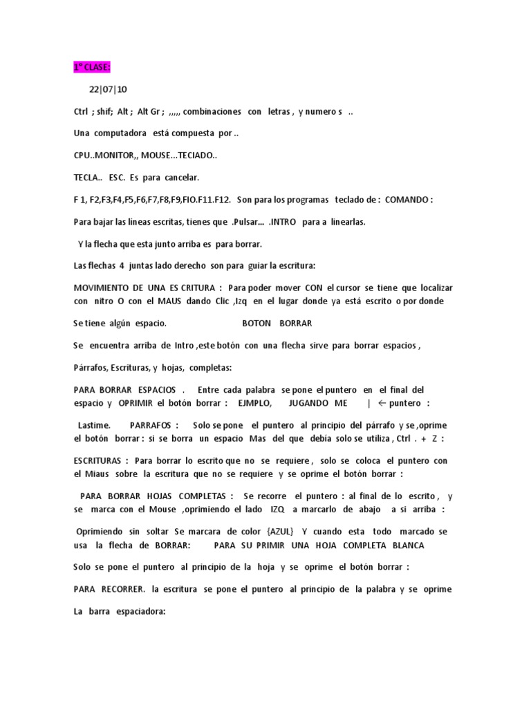 Una computadora est compuesta por .. CPU..MONITOR,, MOUSE...TECIADO.. TECLA.. ESC. Es para cancelar. F 1, F2,F3,F4,F5,F6,F7,F8,F9,FIO.F11.F12. Son para los programas teclado de : COMANDO : Para bajar las lneas escritas, tienes que .Pulsar .INTRO para a linearlas. Y la flecha que esta junto arriba es para borrar. Las flechas 4 juntas lado derecho son para guiar la escritura: MOVIMIENTO DE UNA ES CRITURA : Para poder mover CON el cursor se tiene que localizar con nitro O con el MAUS dando Clic ,Izq en el lugar donde ya est escrito o por donde Se tiene algn espacio. BOTON BORRAR