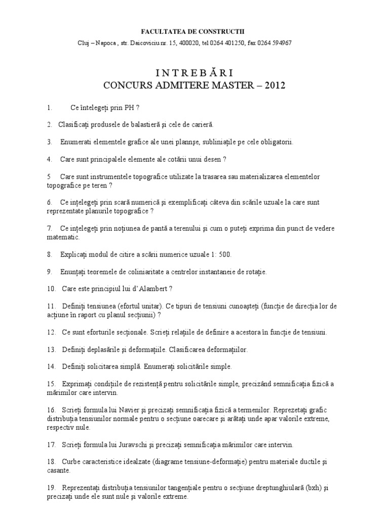 2. Clasificai produsele de balastier i cele de carier. 3. Enumerati elementele grafice ale unei planne, subliniaile pe cele obligatorii. 4. Care sunt principalele elemente ale cotrii unui desen ? 5 Care sunt instrumentele topografice utilizate la trasarea sau materializarea elementelor topografice pe teren ? 6. Ce inelegei prin scar numeric i exemplificai cteva din scrile uzuale la care sunt reprezentate planurile topografice ? 7. Ce inelegei prin noiunea de pant a terenului i cum o putei exprima din punct de vedere matematic. 8. Explicai modul de citire a scrii numerice uzuale 1: 500. 9. Enunai teoremele de coliniaritate a centrelor instantaneie de rotaie. 10. Care este principiul lui dAlambert ? 11. Definii tensiunea (efortul unitar). Ce tipuri de tensiuni cunoatei (funcie de direcia lor de aciune n raport cu planul seciunii) ? 12. Ce sunt eforturile secionale. Scriei relaiile de definire a acestora n funcie de tensiuni. 13. Definii deplasrile i deformaiile. Clasificarea deformaiilor. 14. Definii solicitarea simpl. Enumerai solicitrile simple. 15. Exprimai condiiile de rezisten pentru solicitrile simple, preciznd semnificaia fizic a mrimilor care intervin. 16. Scriei formula lui Navier i precizai semnificaia fizic a termenilor. Reprezetai grafic distribuia tensiunilor normale pentru o seciune oarecare i artai unde apar valorile extreme, respectiv nule. 17. Scriei formula lui Juravschi i precizai semnificaia mrimilor care intervin. 18. Curbe caracteristice idealzate (diagrame tensiune-deformaie) pentru materiale ductile i casante. 19. Reprezentai distribuia tensiunilor tangeniale pentru o seciune dreptunghiular (bxh) i precizai unde ele sunt nule i valorile extreme.