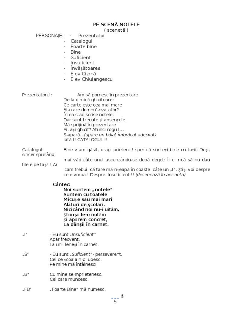 Cntec: Noi suntem notele Suntem cu toatele Micu e sau mai mari Alturi de colari. Nicicnd noi nu-i uitm, tiin a le-o not m i ap rem concret, La dnii n carnet. I - Eu sunt Insuficient Apar frecvent, La unii lenei n carnet. - Eu sunt Suficient- perseverent, Cei ce coala n-o iubesc, Pe mine m ntlnesc! Cu mine se-mprietenesc, Cei care muncesc. Foarte Bine m numesc,
