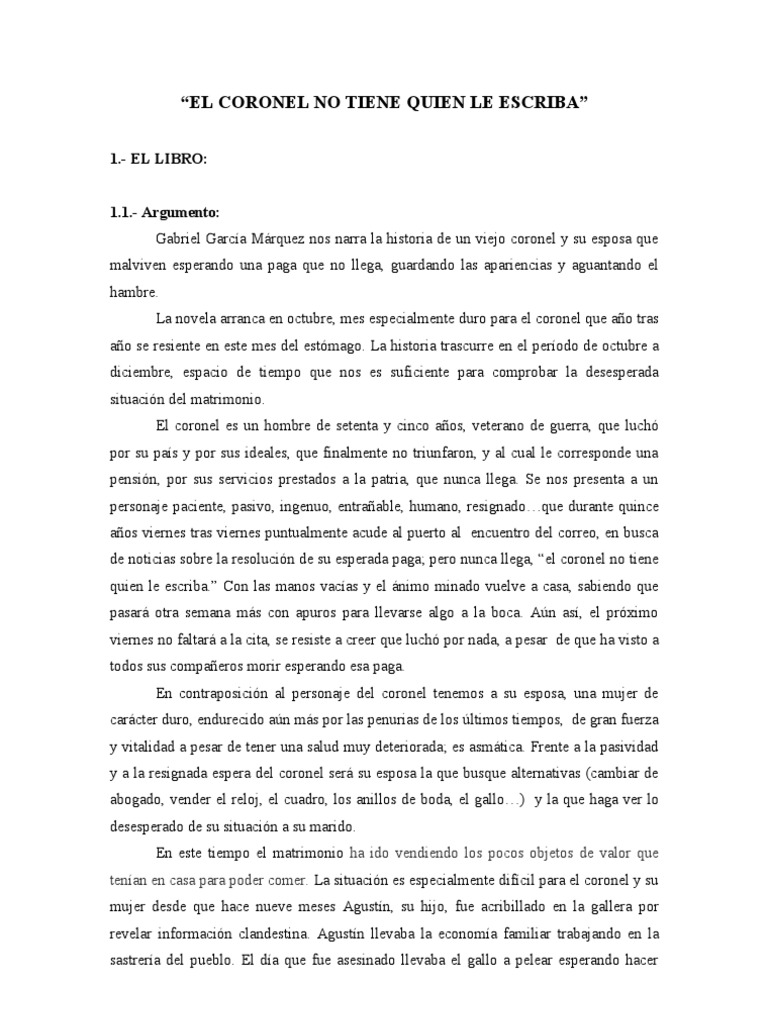 1.- EL LIBRO: 1.1.- Argumento: Gabriel Garca Mrquez nos narra la historia de un viejo coronel y su esposa que malviven esperando una paga que no llega, guardando las apariencias y aguantando el hambre. La novela arranca en octubre, mes especialmente duro para el coronel que ao tras ao se resiente en este mes del estmago. La historia trascurre en el perodo de octubre a diciembre, espacio de tiempo que nos es suficiente para comprobar la desesperada situacin del matrimonio. El coronel es un hombre de setenta y cinco aos, veterano de guerra, que luch por su pas y por sus ideales, que finalmente no triunfaron, y al cual le corresponde una pensin, por sus servicios prestados a la patria, que nunca llega. Se nos presenta a un personaje paciente, pasivo, ingenuo, entraable, humano, resignadoque durante quince aos viernes tras viernes puntualmente acude al puerto al encuentro del correo, en busca de noticias sobre la resolucin de su esperada paga; pero nunca llega, el coronel no tiene quien le escriba. Con las manos vacas y el nimo minado vuelve a casa, sabiendo que pasar otra semana ms con apuros para llevarse algo a la boca. An as, el prximo viernes no faltar a la cita, se resiste a creer que luch por nada, a pesar de que ha visto a todos sus compaeros morir esperando esa paga. En contraposicin al personaje del coronel tenemos a su esposa, una mujer de carcter duro, endurecido an ms por las penurias de los ltimos tiempos, de gran fuerza y vitalidad a pesar de tener una salud muy deteriorada; es asmtica. Frente a la pasividad y a la resignada espera del coronel ser su esposa la que busque alternativas (cambiar de abogado, vender el reloj, el cuadro, los anillos de boda, el gallo) y la que haga ver lo desesperado de su situacin a su marido. En este tiempo el matrimonio ha ido vendiendo los pocos objetos de valor que tenan en casa para poder comer. La situacin es especialmente difcil para el coronel y su mujer desde que hace nueve meses Agustn, su hijo, fue acribillado en la gallera por revelar informacin clandestina. Agustn llevaba la economa familiar trabajando en la sastrera del pueblo. El da que fue asesinado llevaba el gallo a pelear esperando hacer