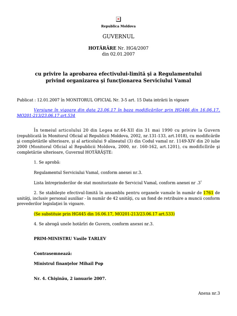 efectivului-limită şi Regulamentului Serviciului Vamal" (Monitorul Oficial al Republicii Moldova,
