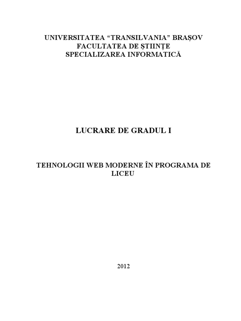 Introducere Capitolul I : Elemente de baz ale unui document HTML Crearea legturilor - Adugarea de imagini grafice pentru cosmetizareapaginilor Tabele i cadre Capitolul II: Elemente multimedia Java Script Capitolul III: Reguli CSS ( foi de stil n cascad) Capitolul IV: Aspecte urmrite n procesul de predare nvare evaluare a TIC Concluzii Bibliografie Anexe