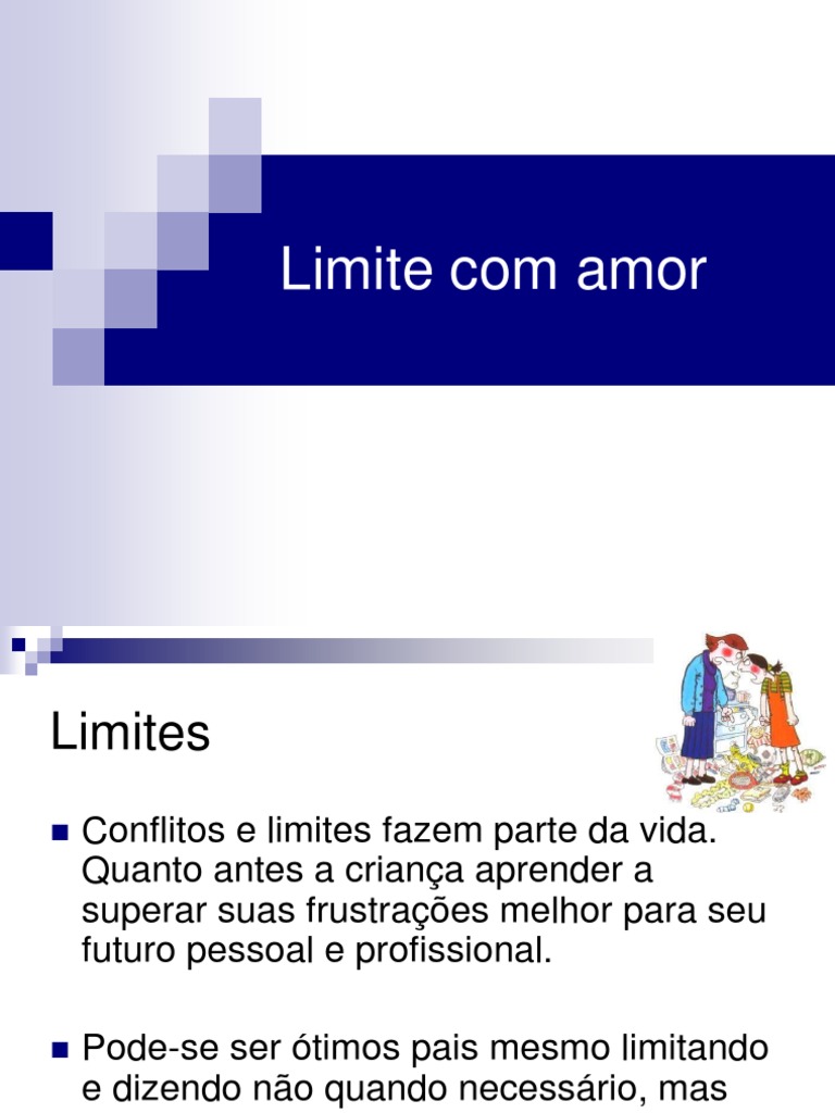Conflitos e limites fazem parte da vida. Quanto antes a criana aprender a superar suas frustraes melhor para seu futuro pessoal e profissional.