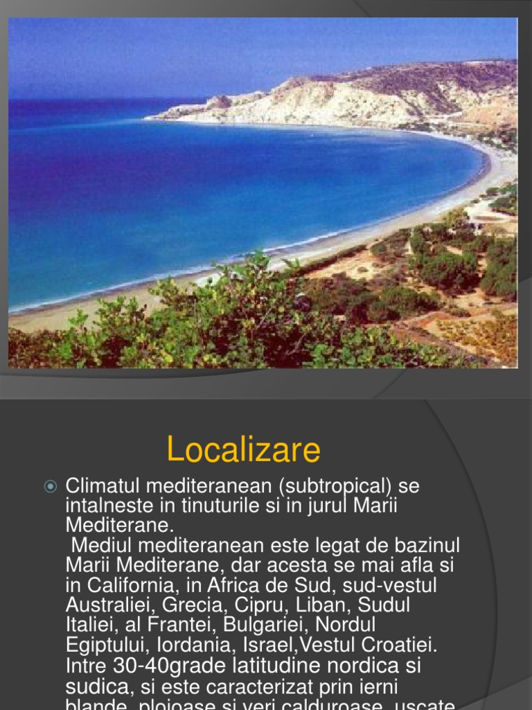 Climatul mediteranean (subtropical) se intalneste in tinuturile si in jurul Marii Mediterane. Mediul mediteranean este legat de bazinul Marii Mediterane, dar acesta se mai afla si in California, in Africa de Sud, sud-vestul Australiei, Grecia, Cipru, Liban, Sudul Italiei, al Frantei, Bulgariei, Nordul Egiptului, Iordania, Israel,Vestul Croatiei. Intre 30-40grade latitudine nordica si sudica, si este caracterizat prin ierni blande, ploioase si veri calduroase, uscate, avand regiuni intens populate si cu multiple modificari in peisaje.