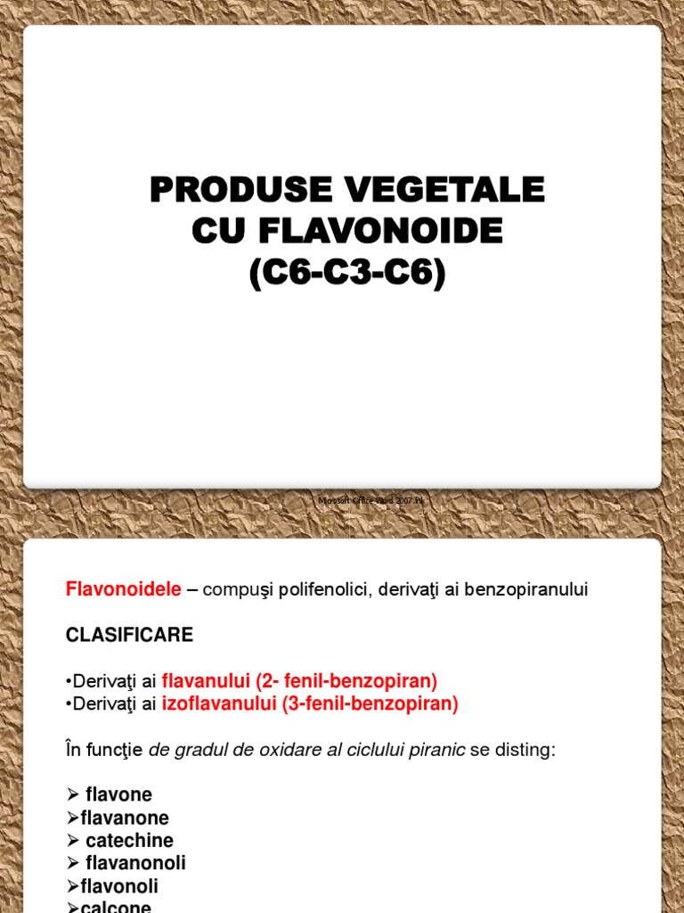 Flavonoidele compui polifenolici, derivai ai benzopiranului CLASIFICARE Derivai ai flavanului (2- fenil-benzopiran) Derivai ai izoflavanului (3-fenil-benzopiran) n funcie de gradul de oxidare al ciclului piranic se disting: flavone flavanone catechine flavanonoli flavonoli calcone antociani aurone