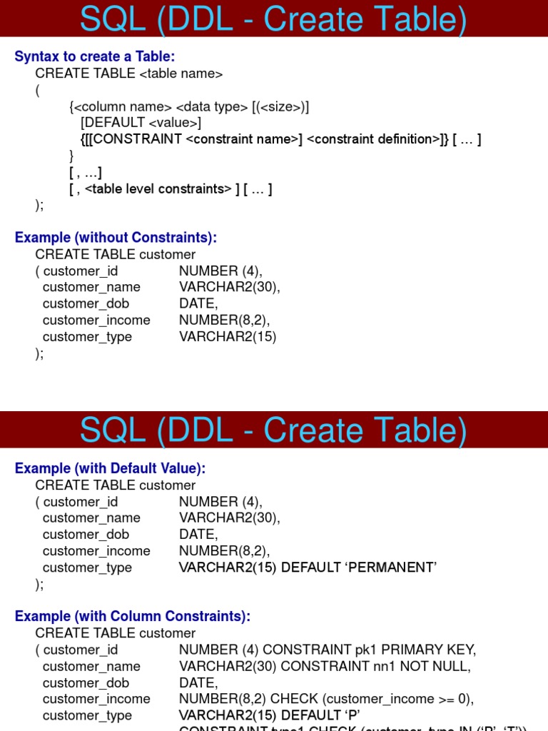 Example (with Default Value): CREATE TABLE customer ( customer_id NUMBER (4), customer_name VARCHAR2(30), customer_dob DATE, customer_income NUMBER(8,2), customer_type VARCHAR2(15) DEFAULT PERMANENT ); Example (with Column Constraints): CREATE TABLE customer ( customer_id NUMBER (4) CONSTRAINT pk1 PRIMARY KEY, customer_name VARCHAR2(30) CONSTRAINT nn1 NOT NULL, customer_dob DATE, customer_income NUMBER(8,2) CHECK (customer_income >= 0), customer_type VARCHAR2(15) DEFAULT P CONSTRAINT type1 CHECK (customer_type IN (P, T)) CONSTRAINT type2 NOT NULL, customer_PAN VARCHAR2(30) CONSTRAINT PAN1 UNIQUE );
