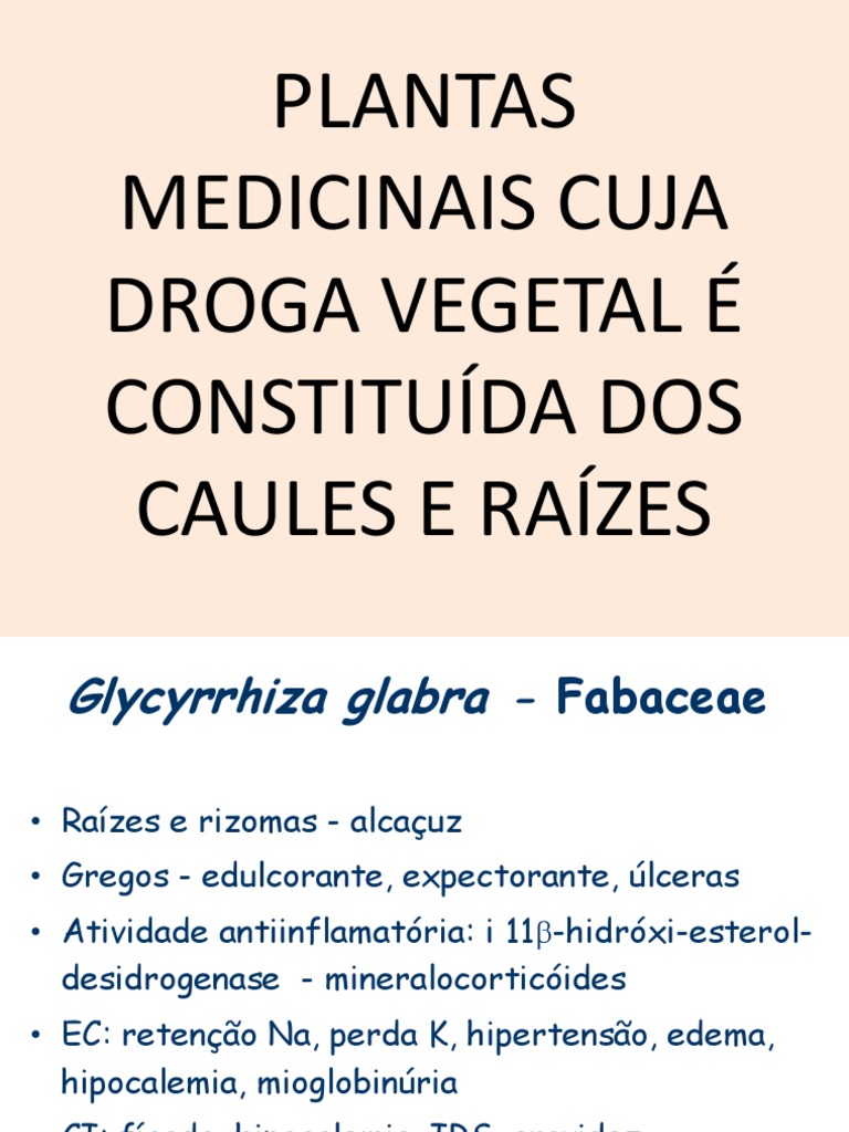 Razes e rizomas - alcauz Gregos - edulcorante, expectorante, lceras Atividade antiinflamatria: i 11-hidrxi-esteroldesidrogenase - mineralocorticides EC: reteno Na, perda K, hipertenso, edema, hipocalemia, mioglobinria CI: fgado, hipocalemia, IRS, gravidez 5 - 15 g raiz --- 200 - 600 mg glicirrizina