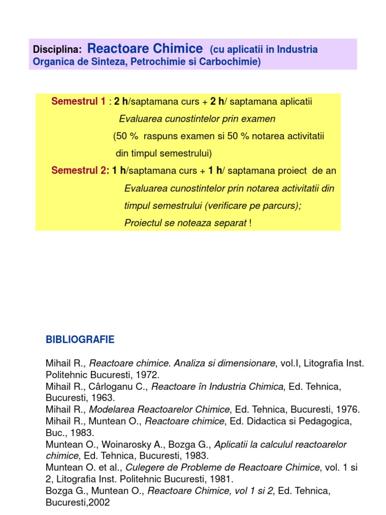 Disciplina: Reactoare Chimice (cu aplicatii in Industria