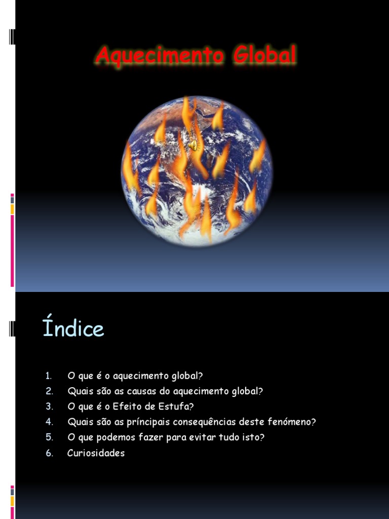 Este trabalho fala sobre o Aquecimento global ; a sua definio, as causas, o que o efeito de estufa, as consequncias do aquecimento global e as curiosidades.