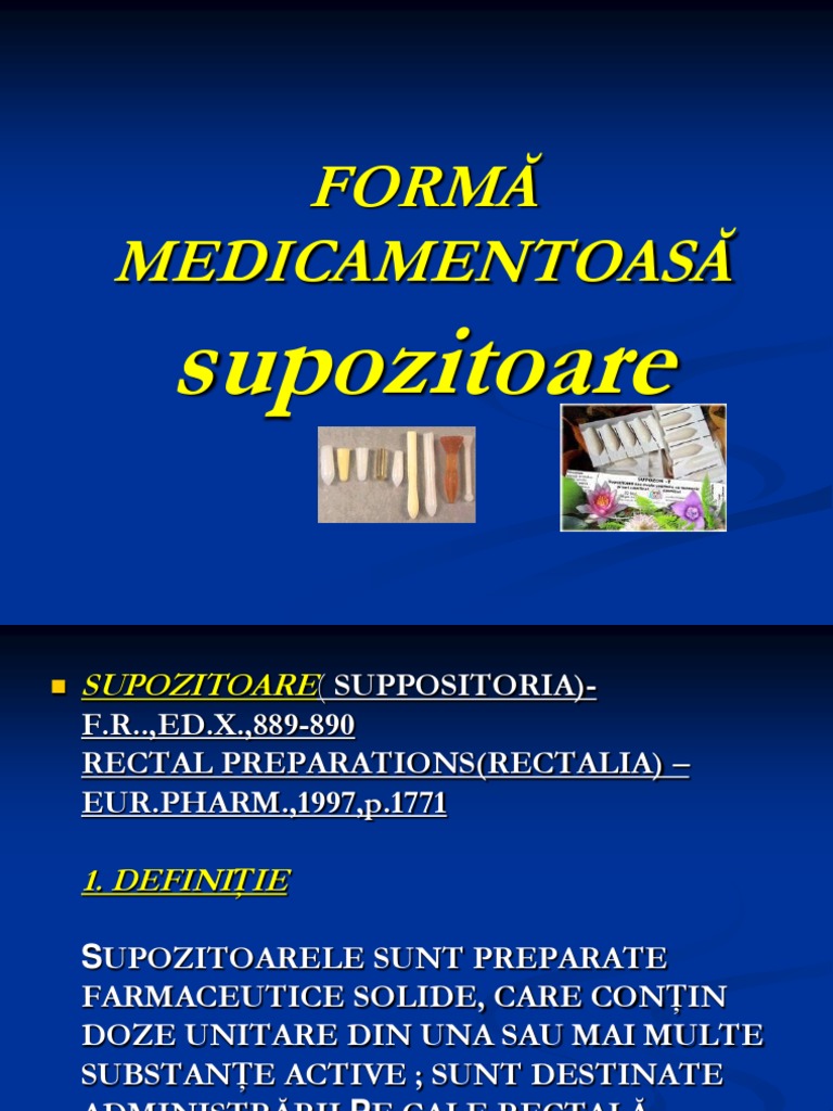 SUPOZITOARELE SUNT PREPARATE FARMACEUTICE SOLIDE, CARE CONIN DOZE UNITARE DIN UNA SAU MAI MULTE SUBSTANE ACTIVE ; SUNT DESTINATE ADMINISTRRII PE CALE RECTAL, VAGINAL SAU URETRAL ( F.R., ed.X., 889-890).