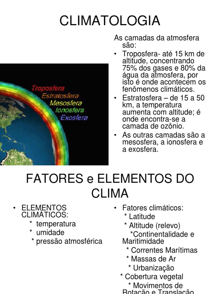 As camadas da atmosfera so: Troposfera- at 15 km de altitude, concentrando 75% dos gases e 80% da gua da atmosfera, por isto onde acontecem os fenmenos climticos. Estratosfera de 15 a 50 km, a temperatura aumenta com altitude; onde encontra-se a camada de oznio. As outras camadas so a mesosfera, a ionosfera e a exosfera.