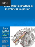 Trunchiul arterial al bratului, asezat in loja sa anterioara. 1. Origine: continua artera axilara de la marginea inferioara a tendonului marelui pectoral, pana la plica de flexie a cotului. 2. Traiect: prin urmatoare regiuni: loja anterioara a bratului si santul bicipital(de la nivelul fosei cubitale). 3. Raporturi: - La brat: 1/3 a bratului nervul median este situat antero-lateral, nervul ulnar este situat medial, nervul radial este situat posterior. In 2/3 inferior al bratului nervul median (nervul satelit al arterei) incruciseaza anterior artera si se dispune medial, nervul ulnar se afla posterior de septul muscular medial in loja posterioara a bratului. - In fosa cubitala artera se afla in santul bicipital medial: nervul median se afla medial anastomoza dintre artera colaterala ulnara inferioara cu ramura anterioara a arterei recurente ulnare.