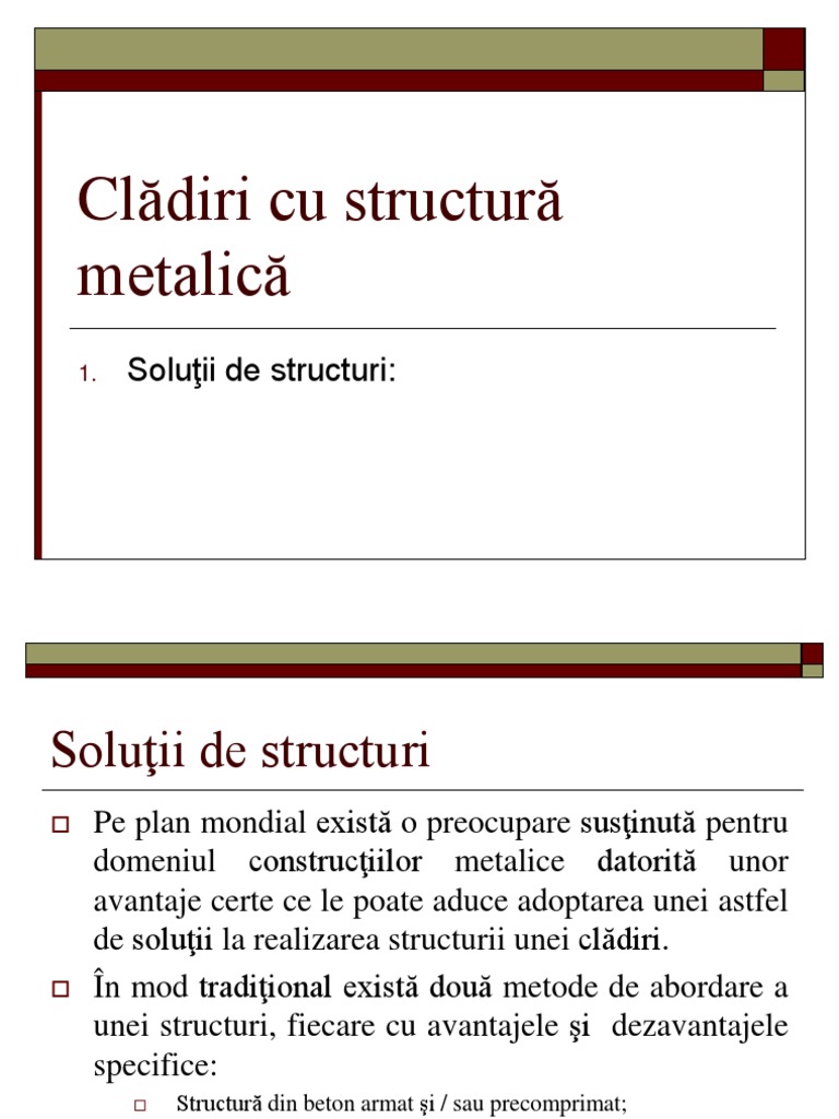 Pe plan mondial exist o preocupare susinut pentru domeniul construciilor metalice datorit unor avantaje certe ce le poate aduce adoptarea unei astfel de soluii la realizarea structurii unei cldiri. n mod tradiional exist dou metode de abordare a unei structuri, fiecare cu avantajele i dezavantajele specifice: