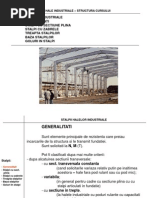 - STRUCTUR CU CADRE PLANE (LUCREAZA PE O DIRECIE) - n sens TRANSVERSAL se concepe o structura rigid (cadru plan), capabil s preia ncrcrile orizontale i verticale - n sens LONGITUDINAL rigiditatea este asigurat prin dispunerea sistemului de contravntuiri - STRUCTUR CU CADRE SPAIALE (LUCREAZ PE DOU DIRECII - structura spatial este alctuit din elemente plane, dispuse i legate ntre ele n diferite moduri - datorit legturilor dintre ele, unele elemente pot prelua o parte din valoarea forelor care acioneaz asupra unor elemente plane i o pot trece asupra altor elemente