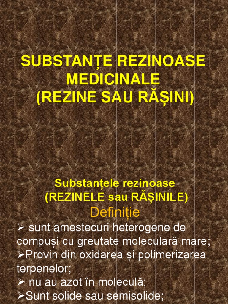 sunt amestecuri heterogene de compui cu greutate molecular mare; Provin din oxidarea i polimerizarea terpenelor; nu au azot n molecul; Sunt solide sau semisolide; Sunt insolubile n ap; Au miros aromat;