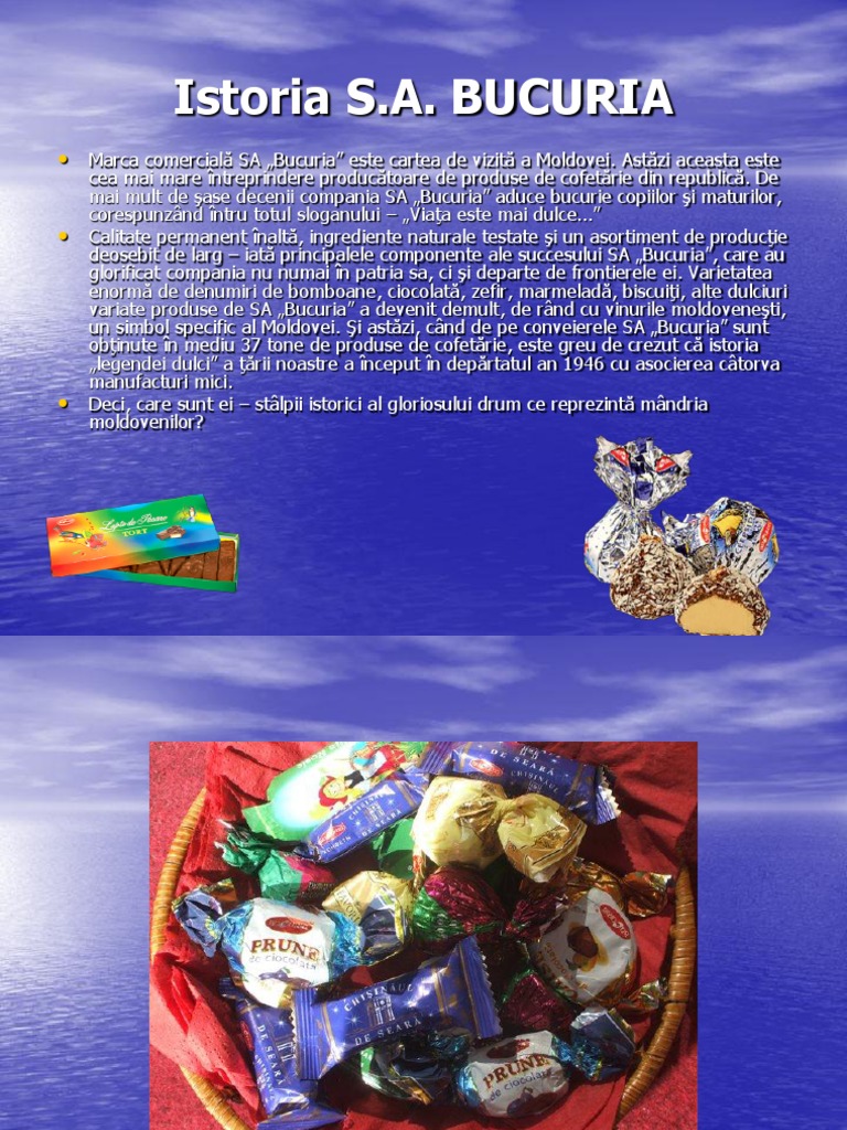 cea mai mare ntreprindere productoare de produse de cofetrie din republic. De mai mult de ase decenii compania SA Bucuria aduce bucurie copiilor i maturilor, corespunznd ntru totul sloganului Viaa este mai dulce Calitate permanent nalt, ingrediente naturale testate i un asortiment de producie deosebit de larg iat principalele componente ale succesului SA Bucuria, care au glorificat compania nu numai n patria sa, ci i departe de frontierele ei. Varietatea enorm de denumiri de bomboane, ciocolat, zefir, marmelad, biscuii, alte dulciuri variate produse de SA Bucuria a devenit demult, de rnd cu vinurile moldoveneti, un simbol specific al Moldovei. i astzi, cnd de pe conveierele SA Bucuria sunt obinute n mediu 37 tone de produse de cofetrie, este greu de crezut c istoria legendei dulci a rii noastre a nceput n deprtatul an 1946 cu asocierea ctorva manufacturi mici. Deci, care sunt ei stlpii istorici al gloriosului drum ce reprezint mndria moldovenilor?