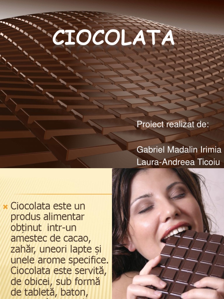 Ciocolata este un produs alimentar obinut intr-un amestec de cacao, zahr, uneori lapte i unele arome specifice. Ciocolata este servit, de obicei, sub form de tablet, baton, praline, ngheat sau alte produse de cofetrie.