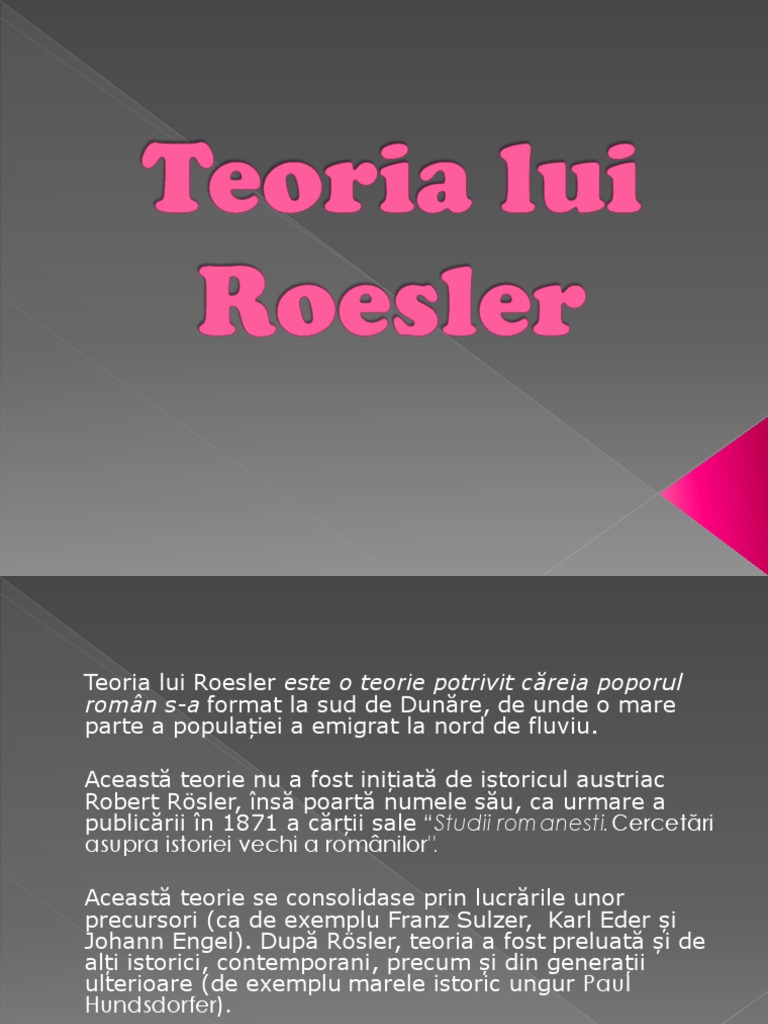 parte a populaiei a emigrat la nord de fluviu. Aceast teorie nu a fost iniiat de istoricul austriac Robert Rsler, ns poart numele su, ca urmare a publicrii n 1871 a crii sale Studii [Link] asupra istoriei vechi a romnilor". Aceast teorie se consolidase prin lucrrile unor precursori (ca de exemplu Franz Sulzer, Karl Eder i Johann Engel). Dup Rsler, teoria a fost preluat i de ali istorici, contemporani, precum i din generaii ulterioare (de exemplu marele istoric ungur Paul Hundsdorfer).