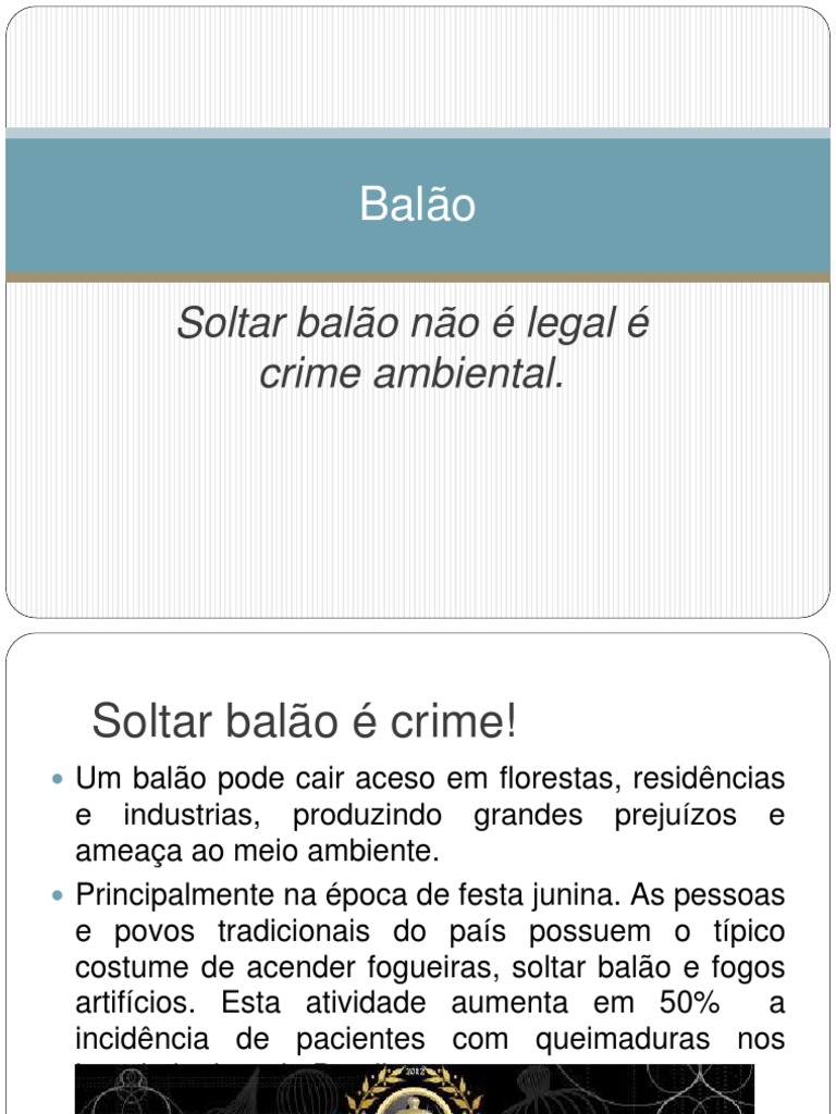 n9.065, de fevereiro de 1998, no somente soltar bales agora crime, como tambm de fabricar, vender ou transportar. A pena prevista de deteno de um a trs anos ou multa de 5.593,99 por balo apreendido.